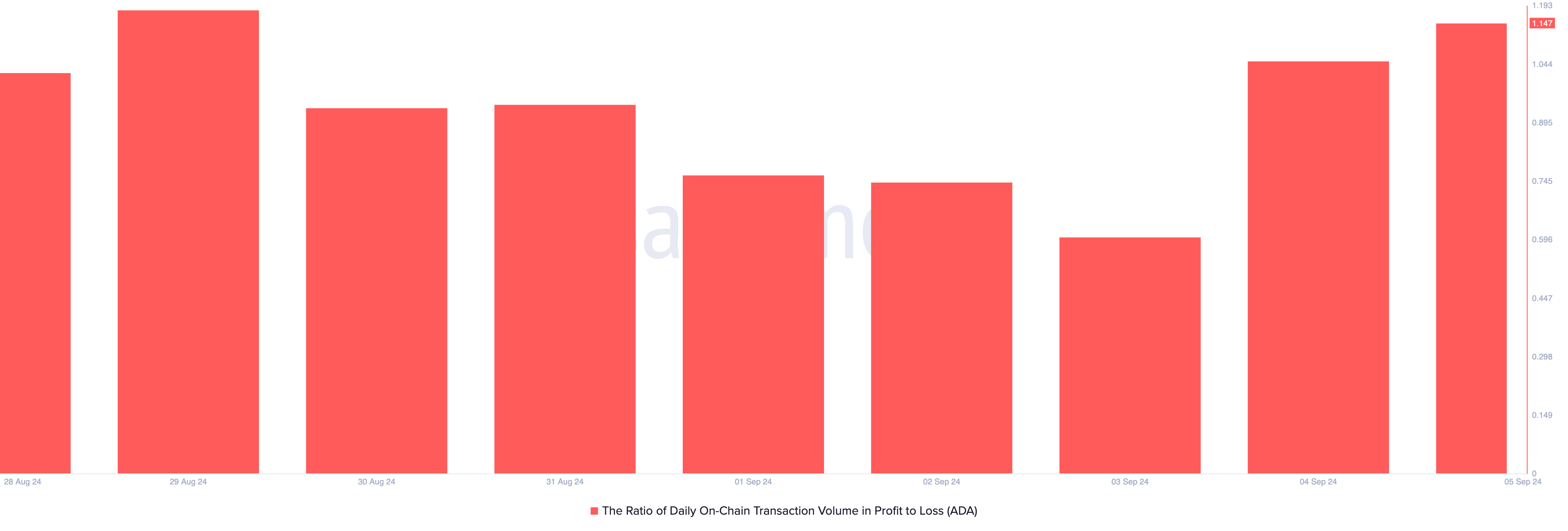 De situatie is echter verbeterd, aangezien dagelijkse transacties met de altcoin winstgevend zijn geworden. Dit blijkt uit de positieve verhouding van het dagelijkse transactievolume van ADA in winst ten opzichte van verlies. Op donderdag staat deze verhouding op 1,15, wat betekent dat voor elke verliesgevende ADA-transactie, er 1,14 transacties met winst worden afgerond.