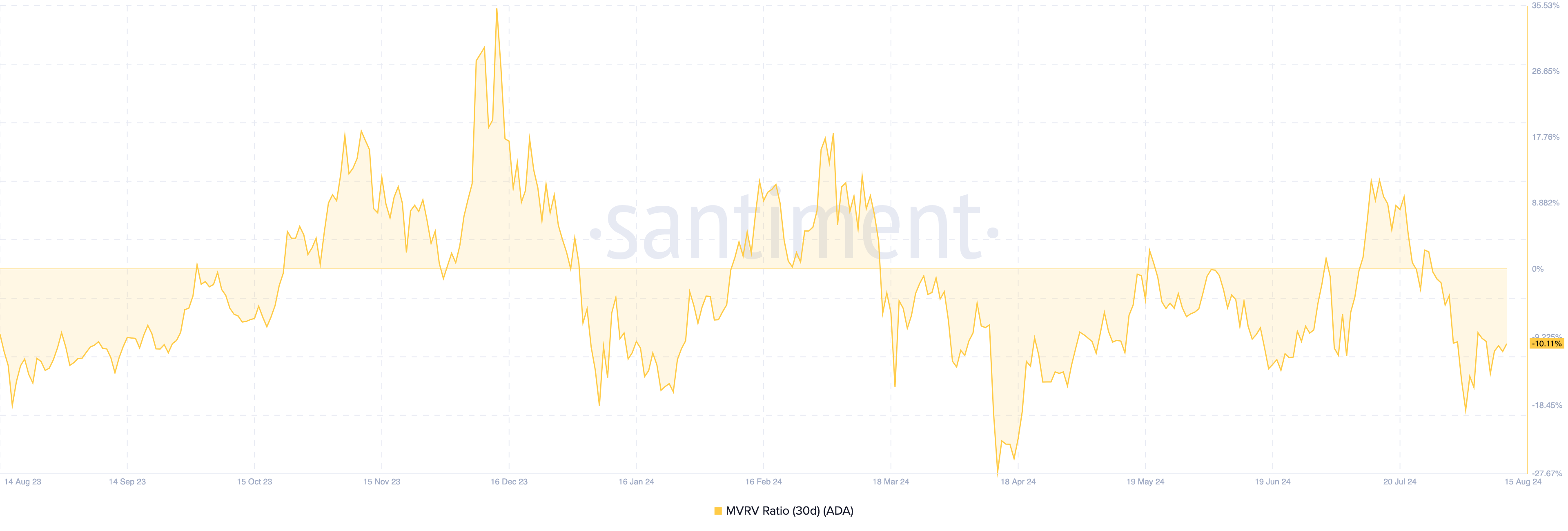 Historisch gezien stuitert de koers van ADA wanneer de MVRV-ratio tussen -7,66% en -27,32% ligt. Daarom, hoewel de koers nog kan dalen, is deze ondergewaardeerd en zou later kunnen stijgen.