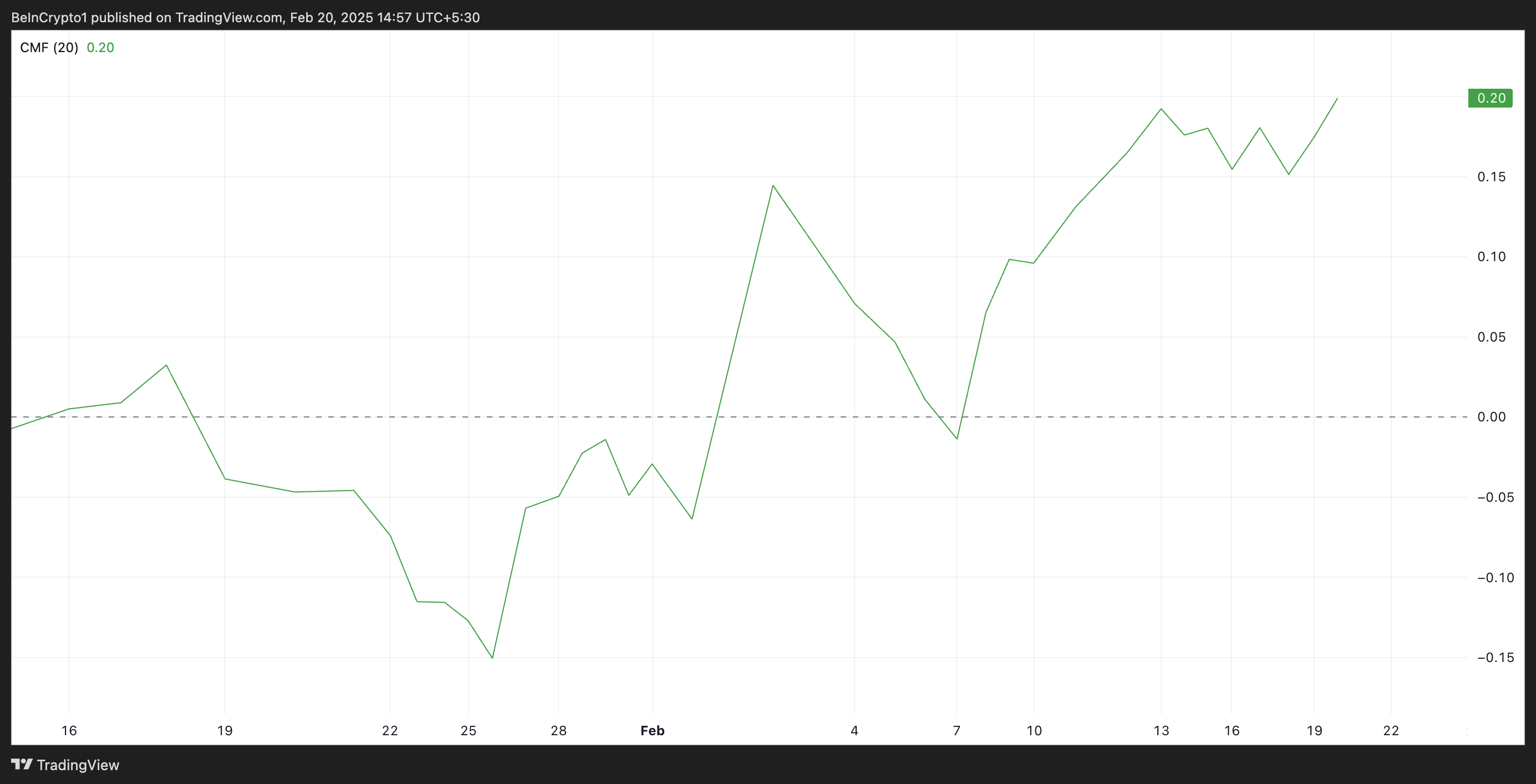 De CMF-indicator meet de liquiditeitsstromen in en uit de markt van een cryptomunt. Wanneer de waarde positief is, duidt dit op aanzienlijke koopdruk en domineren de bulls de markt. Aan de andere kant suggereert een negatieve CMF-waarde dat marktdeelnemers de voorkeur geven aan verkopen.