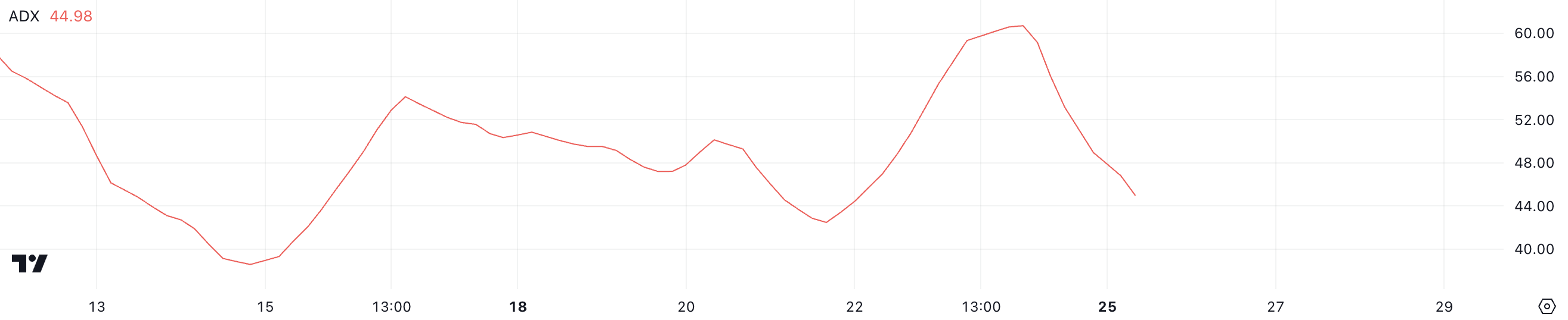 Hoewel een ADX van 45 nog steeds sterk momentum weerspiegelt, wijst de daling van 60 op een verzwakking van de intensiteit van de trend, zelfs als de richting ongewijzigd blijft.