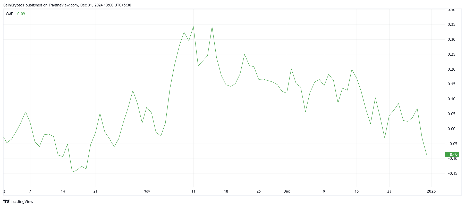 Cardano’s macro-momentum toont verdere zwakte, met de Chaikin Money Flow (CMF) indicator die een laagste punt in twee en een halve maand bereikt. Deze trend geeft aan dat uitstroom momenteel de marktactiviteit van ADA domineert, wat een gebrek aan nieuw kapitaal in het ecosysteem weerspiegelt. De aanhoudende negatieve CMF benadrukt de uitdagingen waarmee ADA te maken heeft om investeerdersvertrouwen aan te trekken.