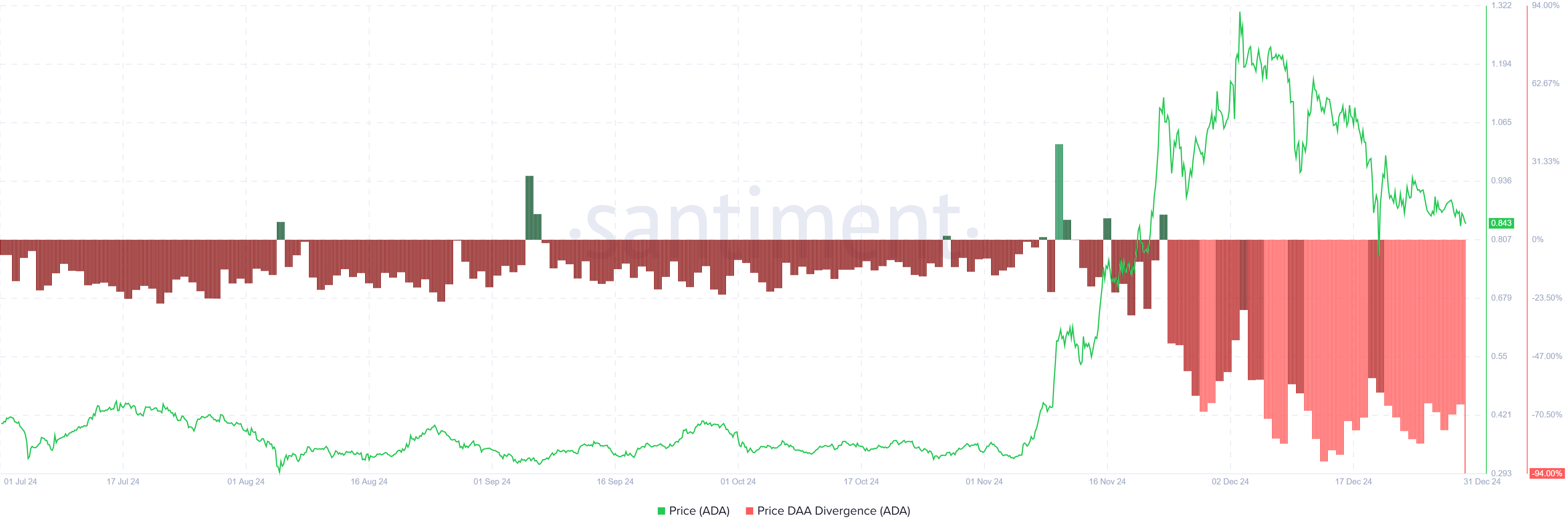De Price DAA Divergence-indicator geeft momenteel een verkoopsignaal, wat de verslechterende marktsentiment van Cardano benadrukt. Dit signaal komt voort uit de combinatie van dalende koersen en verminderde netwerkdeelname. Dergelijke patronen suggereren dat investeerders het vertrouwen verliezen, met onzekerheid over ADA’s herstelpotentieel.