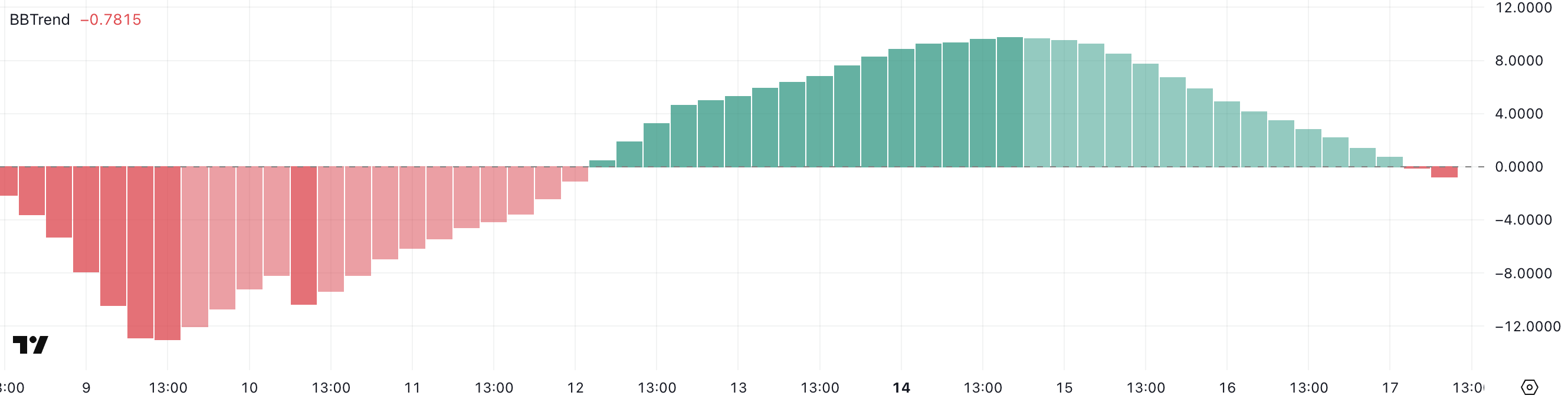 De verschuiving naar -0,78 suggereert dat de recente opwaartse trend van Cardano aan kracht heeft verloren en mogelijk aan het omkeren is. Een negatieve BBTrend-waarde betekent dat de koers nu dichter bij de onderste band beweegt, vaak een teken van stijgende verkoopdruk.