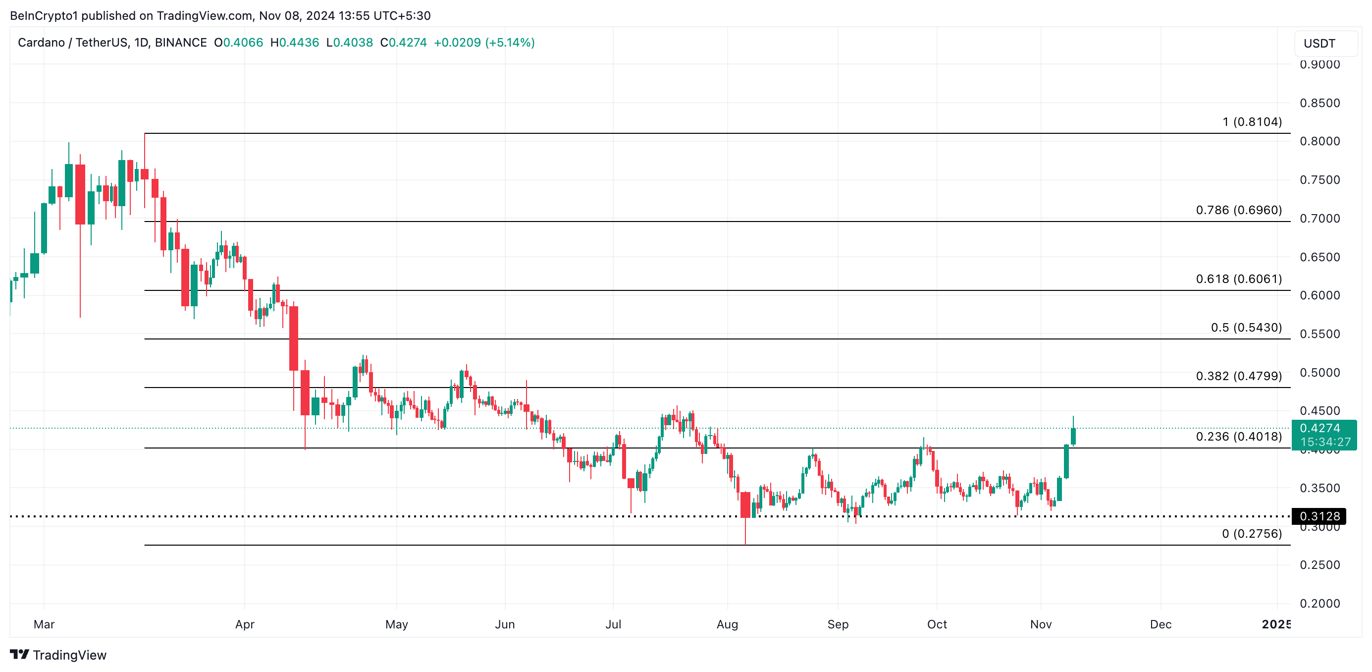 Cardano (ADA) is in slechts drie dagen met 25% gestegen, waarbij voor het eerst sinds juli de $0,43-grens is doorbroken.