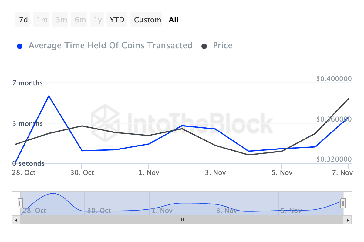 Deze indrukwekkende rally wordt aangedreven door verhoogde activiteit van grote Cardano-bezitters, een toename in de gemiddelde duur van het bezit van de coin, en stijgende vraag naar de altcoin.