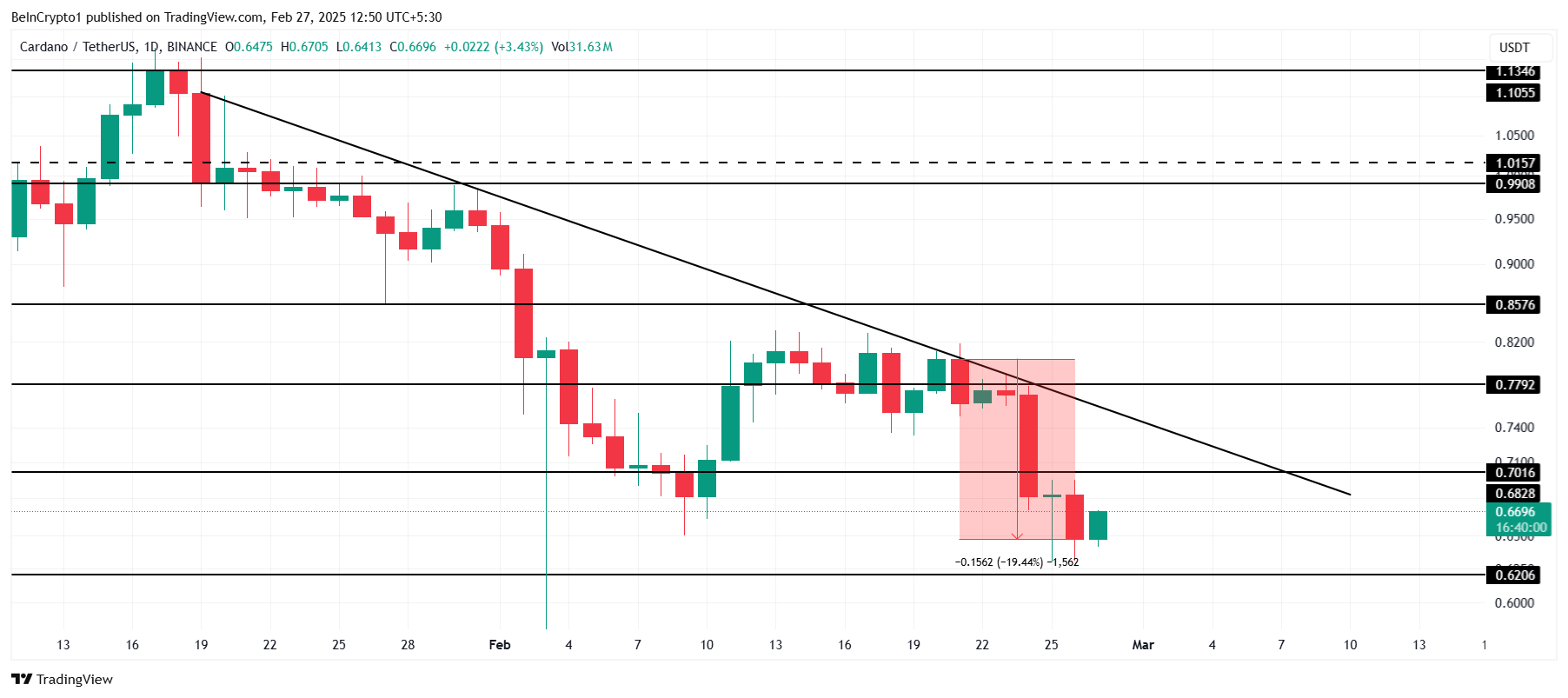 Als Cardano er echter niet in slaagt de weerstand van $0,70 te doorbreken, kan de koers terugvallen naar $0,62 of lager. Het verliezen van de $0,62-steun kan ADA nog verder naar beneden drukken, mogelijk onder $0,60, en de bullish Cardano verwachting ongeldig maken.