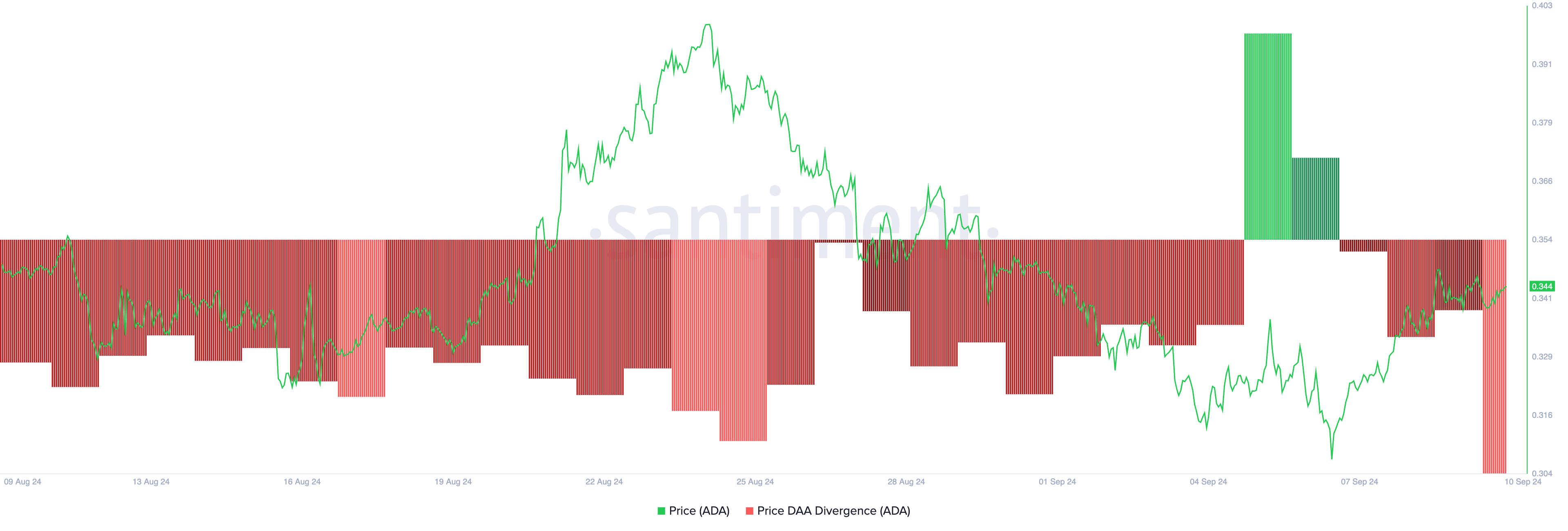 Hoewel Cardano de afgelopen week een koersrally heeft doorgemaakt, lijkt de stijging niet houdbaar. Dit blijkt uit de negatieve Daily Active Address (DAA) divergentie, een metriek die de koersbeweging van een cryptomunt analyseert in combinatie met veranderingen in het aantal dagelijkse actieve adressen. Sinds 3 september vertoont deze metriek consistent negatieve waarden, wat duidt op een zwakke ondersteuning van de recente koerswinsten.