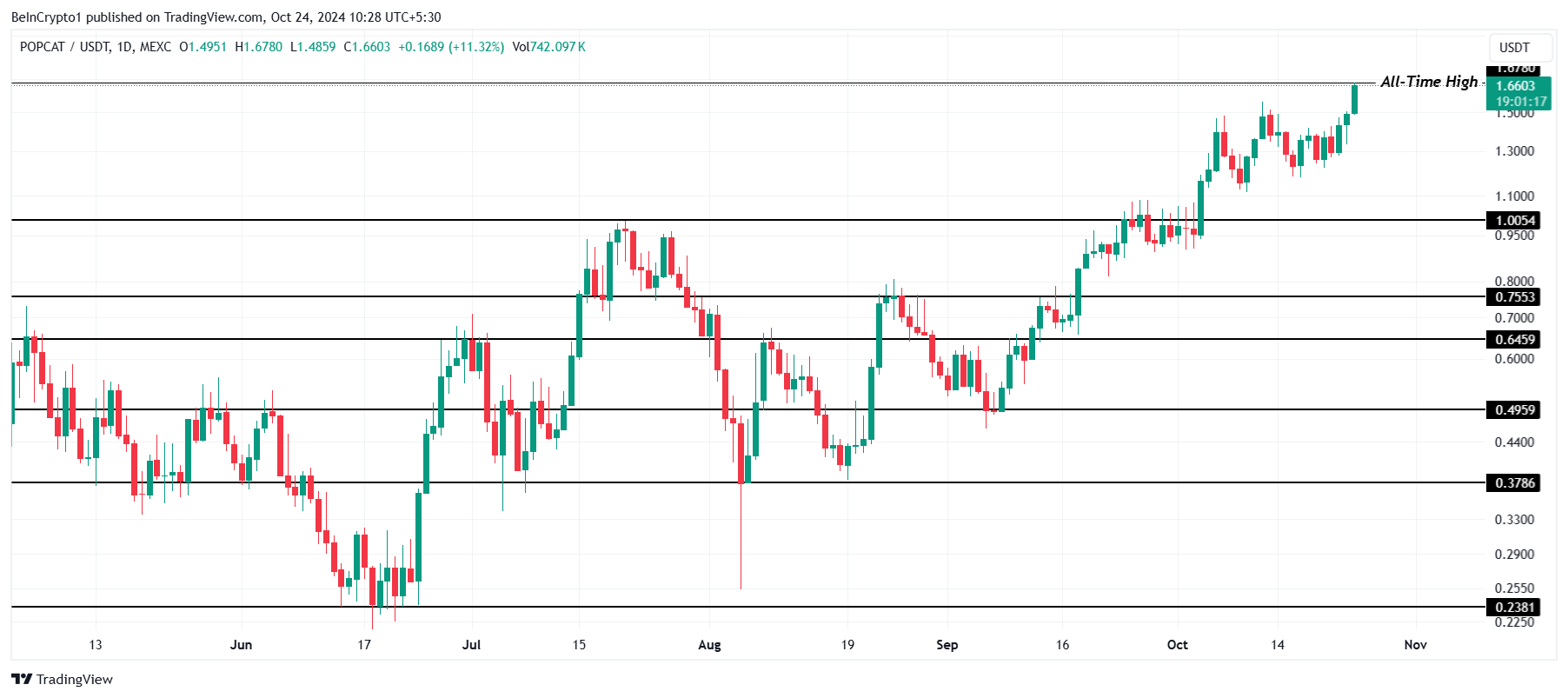Solana meme coin POPCAT bereikte vandaag een nieuwe all-time high van $1,67 na consistente winsten gedurende oktober. Dit markeert de derde ATH voor de meme coin deze maand, wat zijn sterke opwaartse momentum bevestigt. De voortdurende stijging heeft de aandacht van investeerders getrokken, wat het vertrouwen in zijn kortetermijngroeipotentieel versterkt.