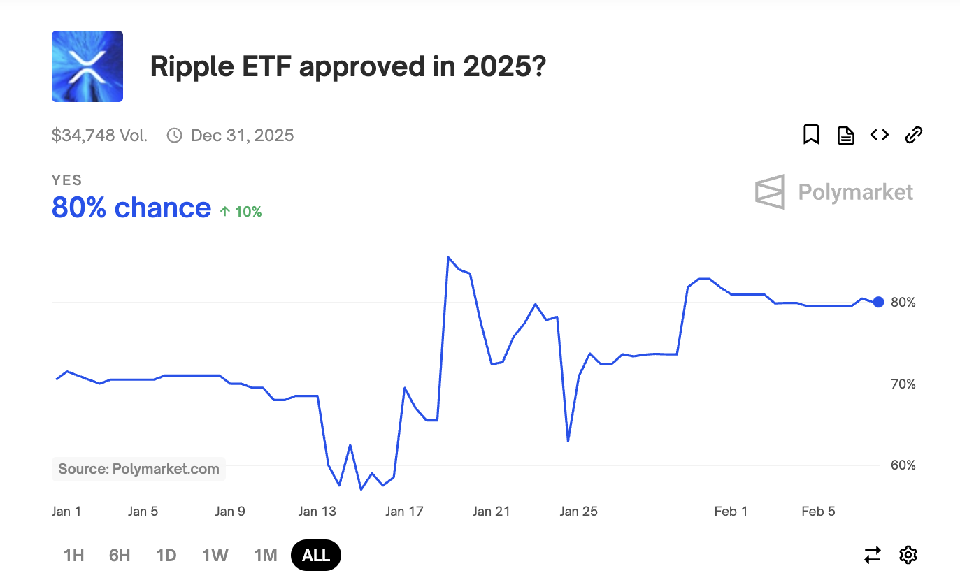 Op het voorspelling platform Polymarket is de kans dat een XRP ETF goedkeuring krijgt in 2025 opvallend hoog. De kans stond op een opmerkelijke 80% op het moment van dit rapport.