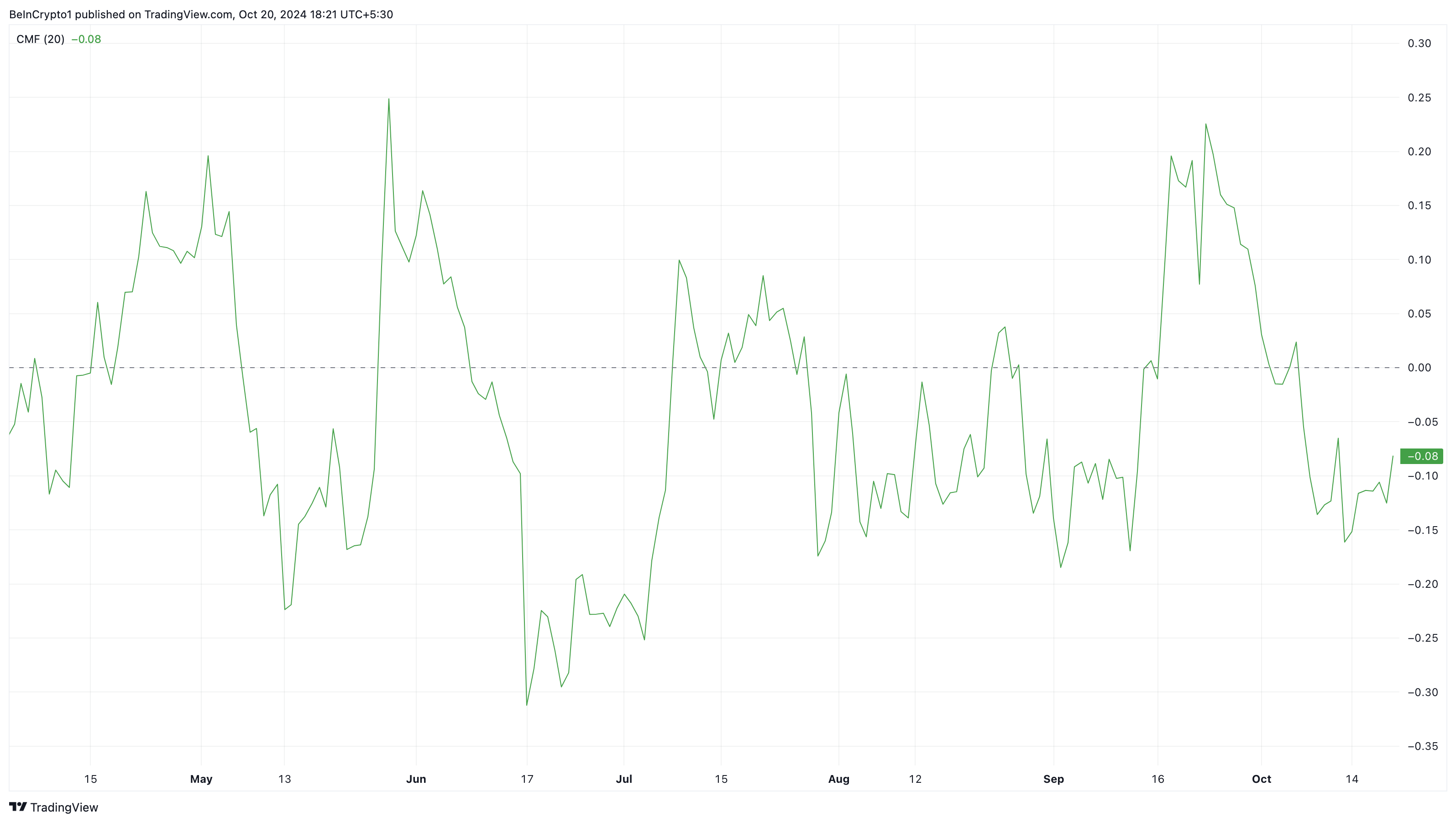 Verder oscilleert de indicator boven en onder nul, waarbij positieve waarden een opwaartse trend aangeven en negatieve waarden een neerwaartse trend. Zoals hieronder te zien is, bevindt de CMF-waarde zich in het negatieve gebied, wat suggereert dat de koers van TIA binnenkort een aanzienlijke daling kan ervaren.