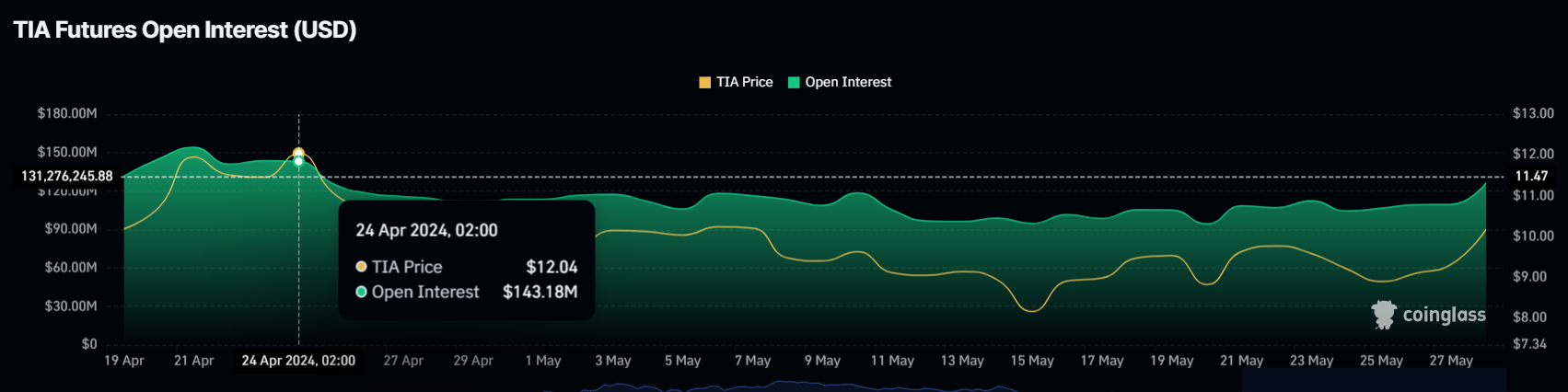 Hetzelfde sentiment zien we bij traders, omdat de futuresmarkt een sterke instroom laat zien. De TIA open interest staat momenteel op een maandelijkse high van $126 miljoen.