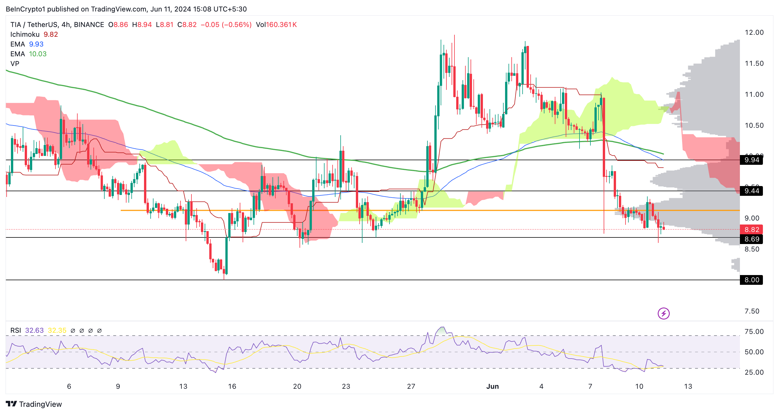 Sponsored SponsoredOp dezelfde manier is $9,94 een ander sterk weerstandspunt, ondersteund door historische koersactie en trading volumes. De 4H-RSI is gedaald tot onder de 30 en herstelt zich nu tot 38, wat wijst op een mogelijke verschuiving in het sentiment omdat de koers als oversold wordt beschouwd.