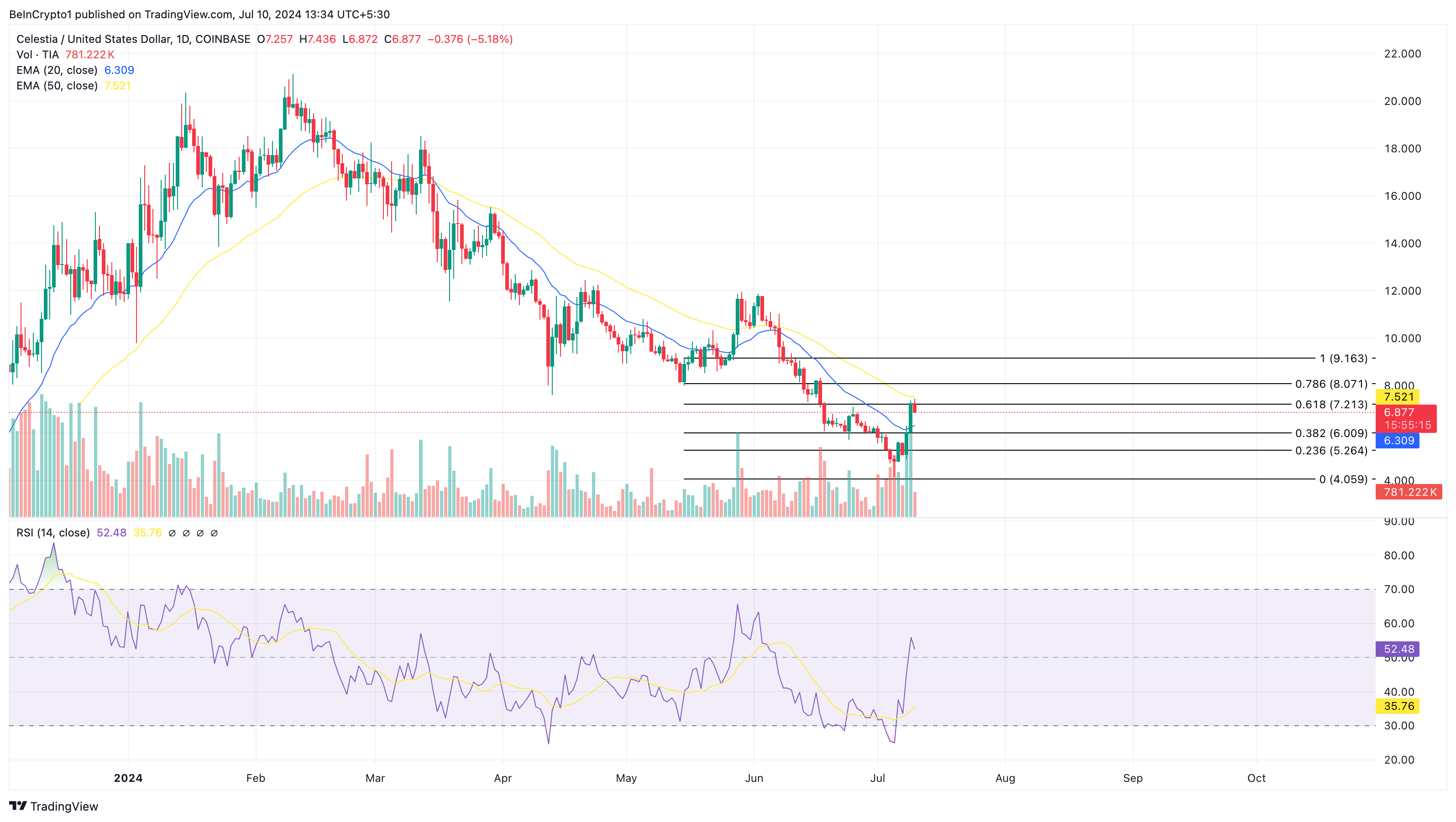 In de afgelopen 24 uur is de TIA koers met 17,36% gestegen. De cryptocurrency wordt momenteel verhandeld op $7,16 en analyse onthult dat de stijging nog niet voorbij is. Dit is hoe.