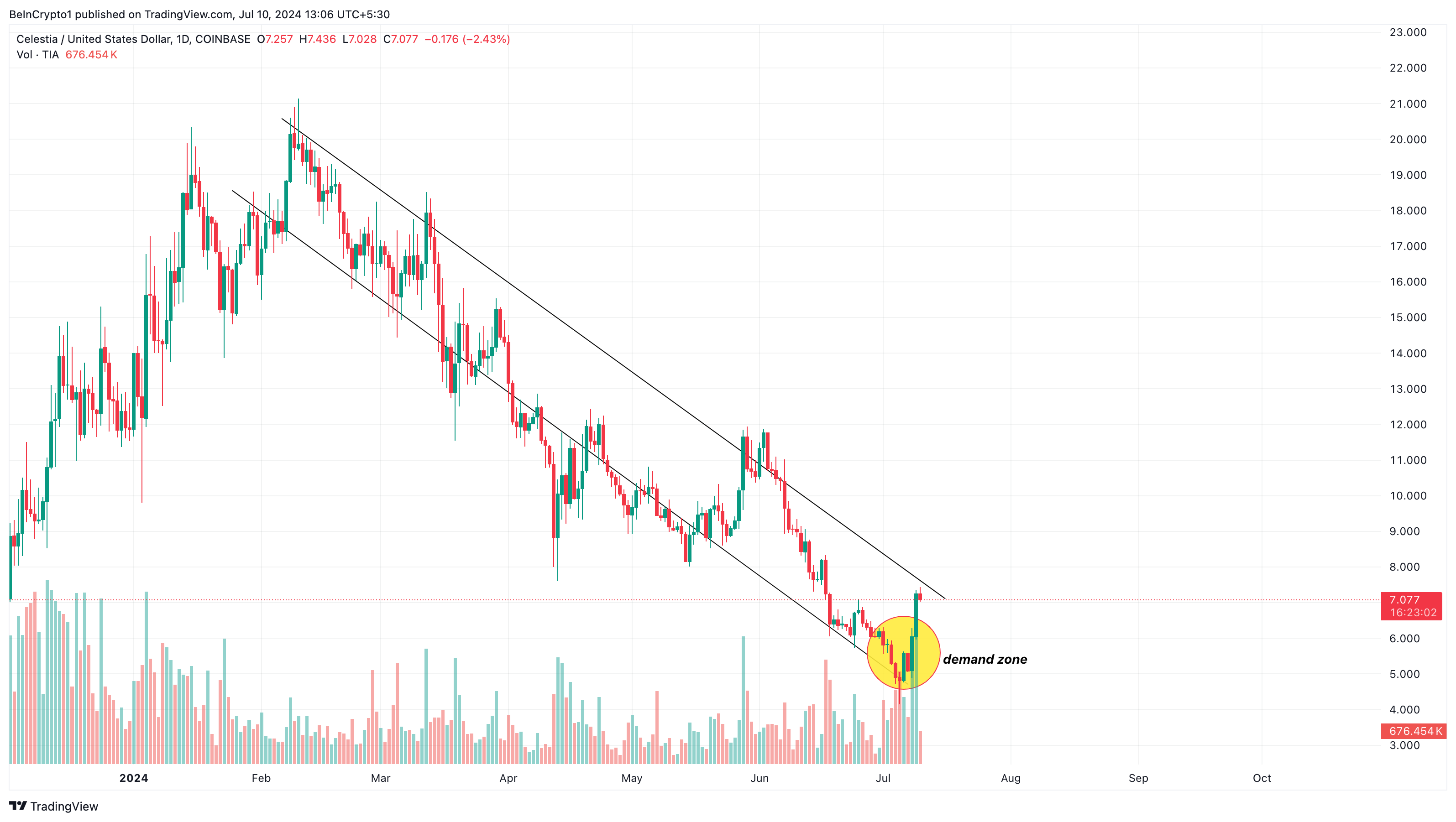 • Celestia's native token brak uit het dalende kanaal nu de dagelijkse grafiek signalen laat zien van een aanhoudende rally.