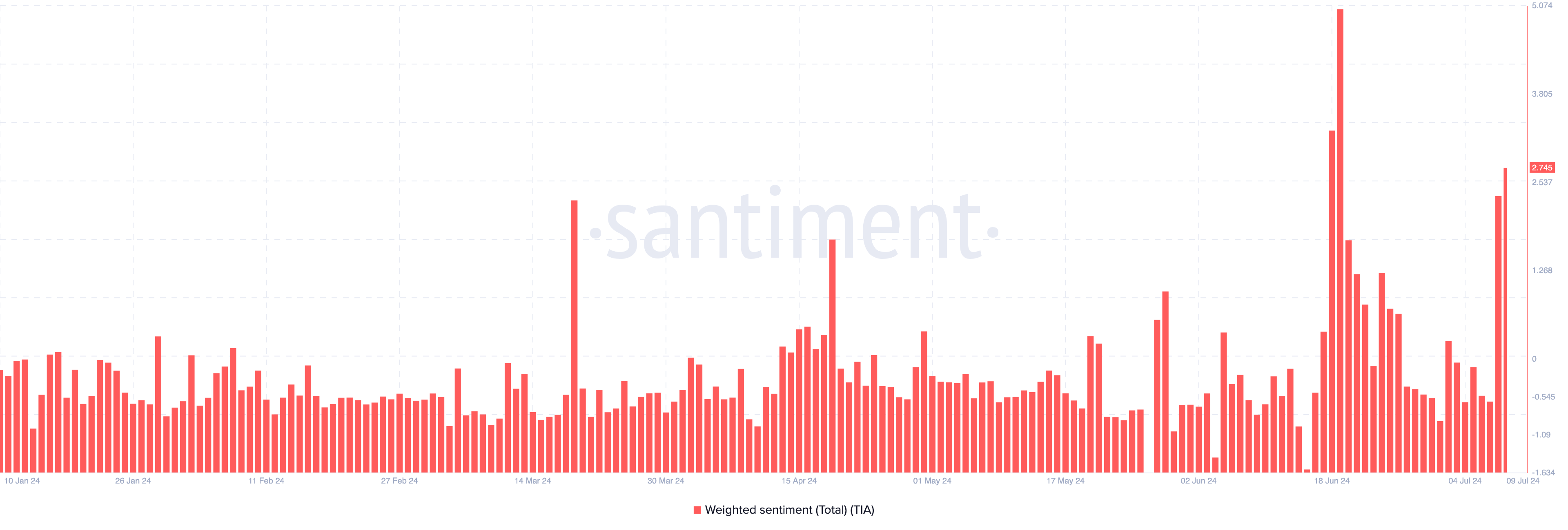 Vanuit een on-chain perspectief laten de data van Santiment zien dat het sentiment rond Celestia ten goede is veranderd. Met behulp van de Weighted Sentiment-metriek, zien we dat de waardering van -0,633 op 7 juli 2,745 is op het moment van schrijven.