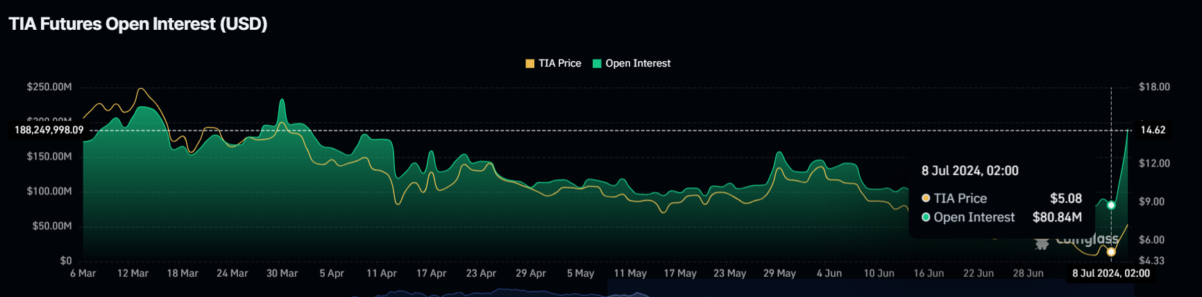 Celestia’s open interest is de afgelopen twee dagen sterk gestegen en verdubbelde van $80 miljoen naar $190 miljoen. Deze scherpe stijging duidt op een aanzienlijke toename in handelsactiviteit en investeringen in de altcoin.