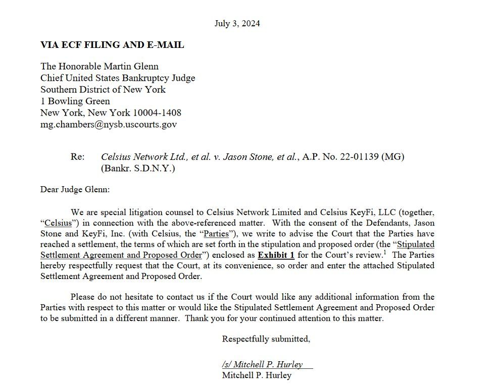 De Raad voor Geschillenbeslechting heeft een officiële brief gestuurd naar de Amerikaanse faillissementsrechter Martin Glenn, waarvan de details werden geredigeerd, waarin staat dat Celsius (de beschuldigde) en Mr. Stone (de eiser) een schikkingsovereenkomst hebben bereikt.