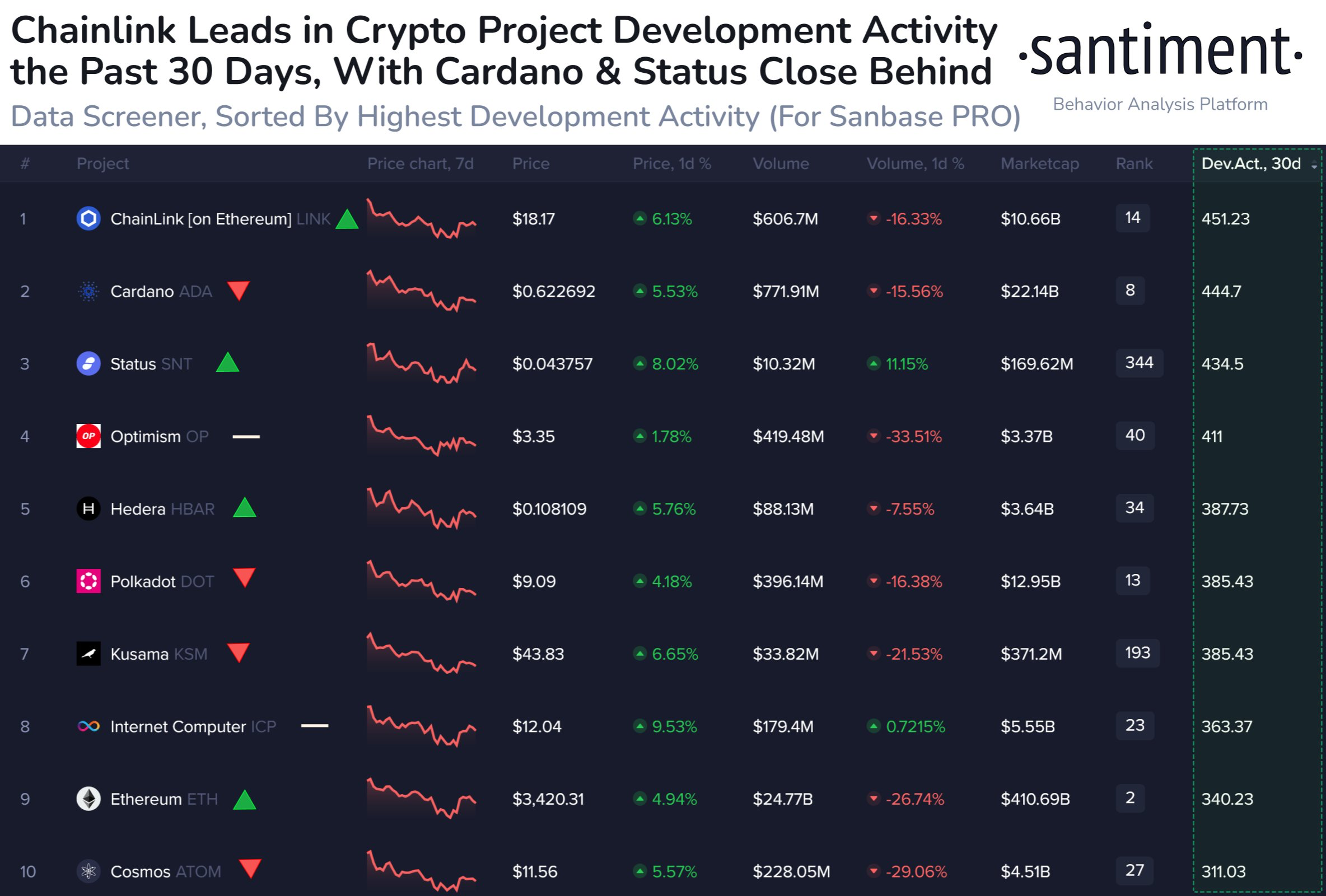 Volgens recente blockchainanalyses van Santiment voeren Chainlink, Cardano en Polkadot de groep aan met de meeste sterke githubactiviteit in de afgelopen 30 dagen. Deze metriek, een indicator van projectbijdragen en verbeteringen, positioneert deze digitale assets als belangrijke spelers in de blockchaininnovatie-race.