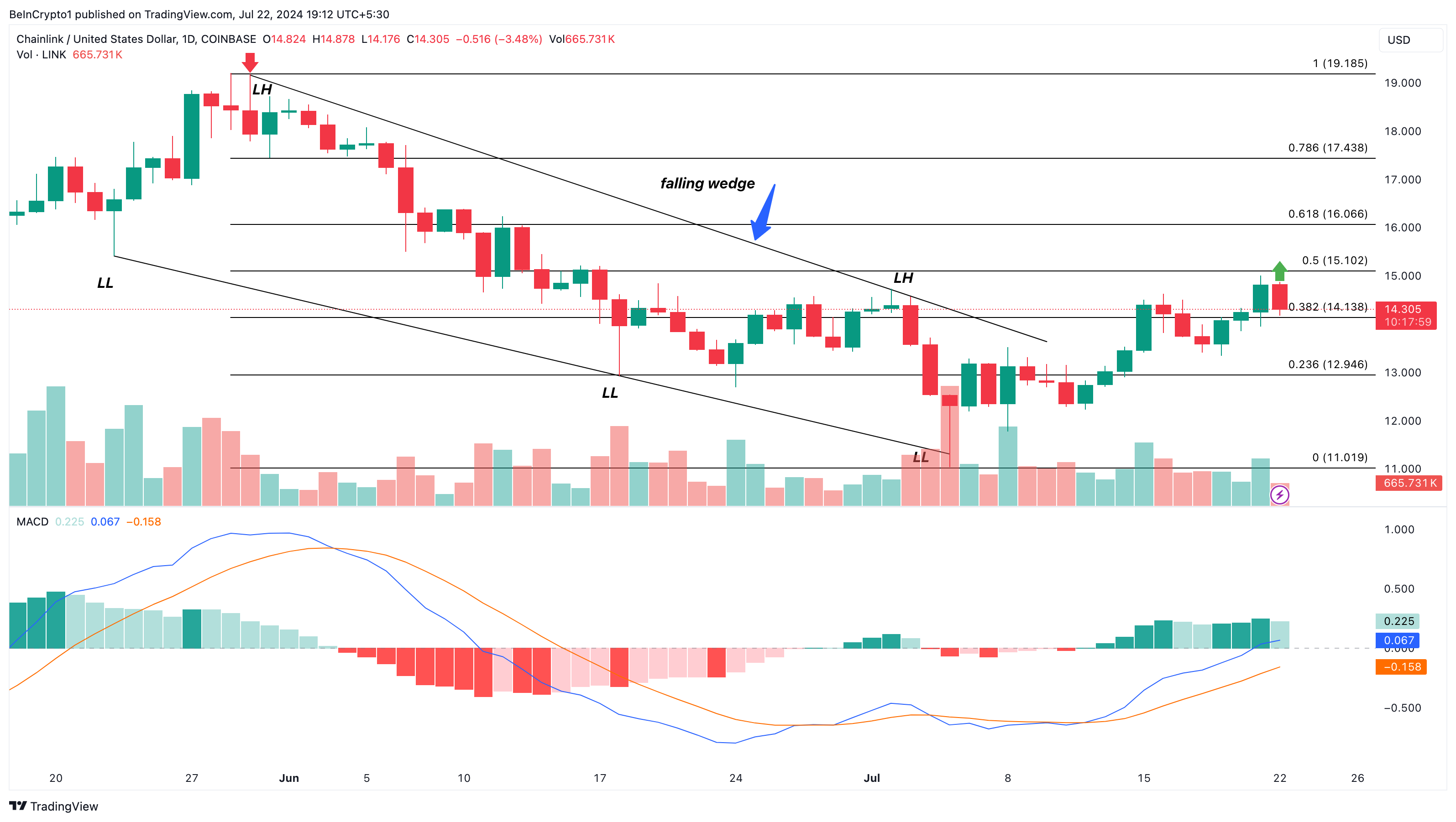 Vanuit technisch oogpunt was de LINK koers in staat om te springen nadat het uitbrak uit een dalende wig. In niet-technische termen is een vallende wig een patroon gevormd door twee dalende trendlijnen.