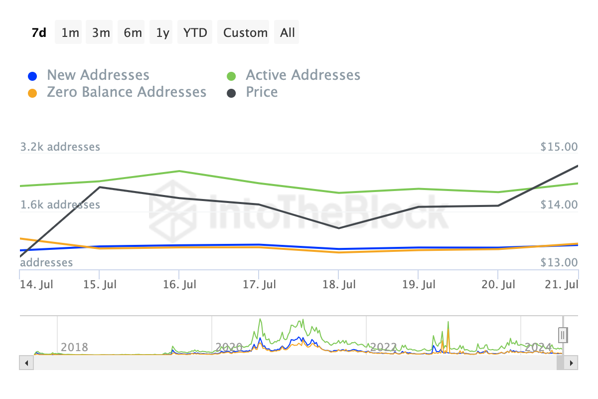 Sponsored SponsoredDe stijging van het aantal nieuwe en actieve adressen op het netwerk ondersteunt ook de potentiële stijging. Volgens IntoTheBlock zijn beide statistieken de afgelopen zeven dagen gestegen.