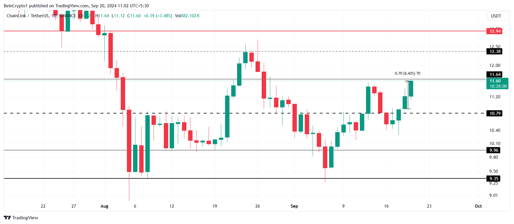De Chainlink koers is in de afgelopen 24 uur met 6,4% gestegen en staat nu op $11,60. Als de lokale weerstand op $11,64 wordt doorbroken, kan LINK mogelijk doorstijgen naar $12,38, een niveau dat eerder onbereikbaar bleek.