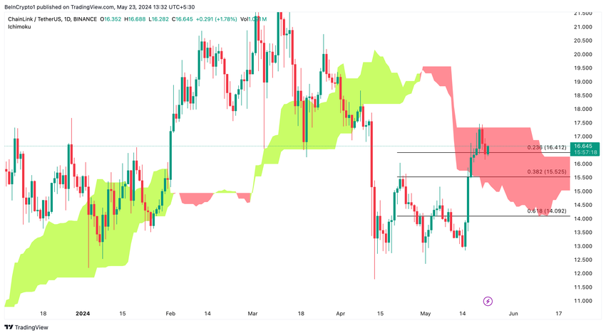 Op het dagelijks tijdframe heeft Chainlink de bovengrens van de Ichimoku-wolk getest, die momenteel rond de $17,41 ligt. Deze test suggereert een sterk weerstandsniveau. Een succesvolle doorbraak boven deze grens zou kunnen wijzen op verder bullish momentum.