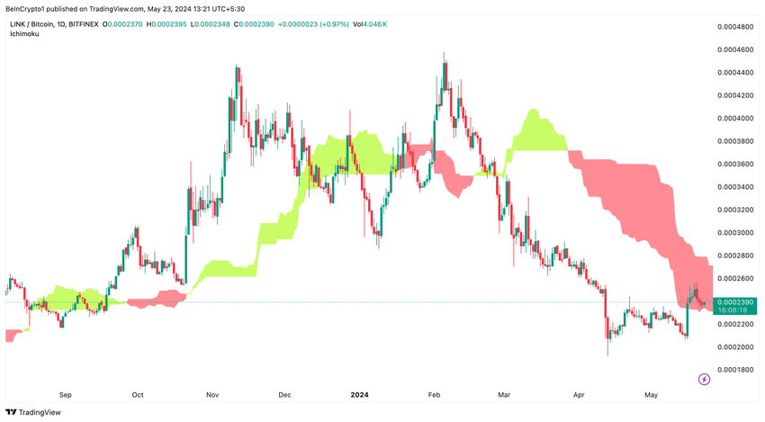 Bovendien is LINK/BTC op het dagelijks tijdframe zojuist de Ichimoku-wolk binnengegaan, wat een signaal is voor een potentieel stijgend traject. Het binnengaan van de wolk is vaak een voorloper van een prijsstijging, wat suggereert dat LINK verdere stijgingen zou kunnen zien ten opzichte van Bitcoin.