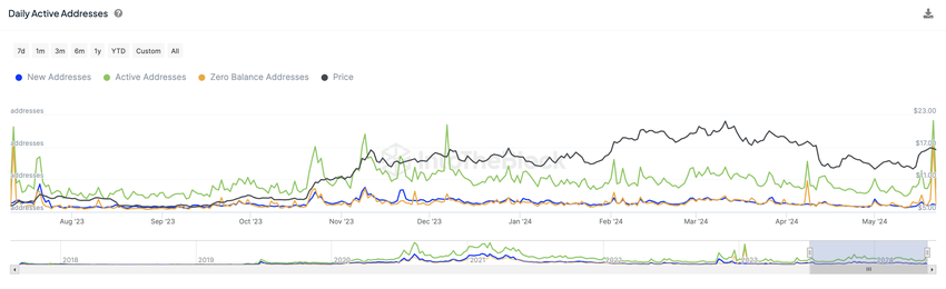 De recente piek in on-chain activiteit voor Chainlink heeft geholpen om de koers te doen stijgen van $13 naar $17. Deze piek in activiteit is duidelijk zichtbaar in de sterke stijging van het aantal dagelijks actieve adressen, zoals te zien is in de grafiek.