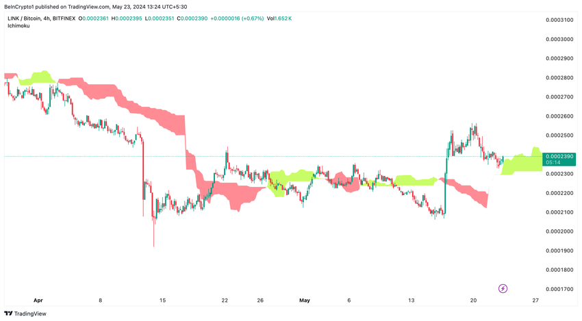 Op het 4 uur durende timeframe handelt LINK boven de Ichimoku-wolk ten opzichte van Bitcoin en test het momenteel de bovengrens ervan. Als LINK deze positie kan handhaven, ondersteunt dit de bullish vooruitzichten. Als LINK er echter niet in slaagt om boven dit niveau te blijven en neerwaarts breekt, zou dit het marktsentiment kunnen veranderen.