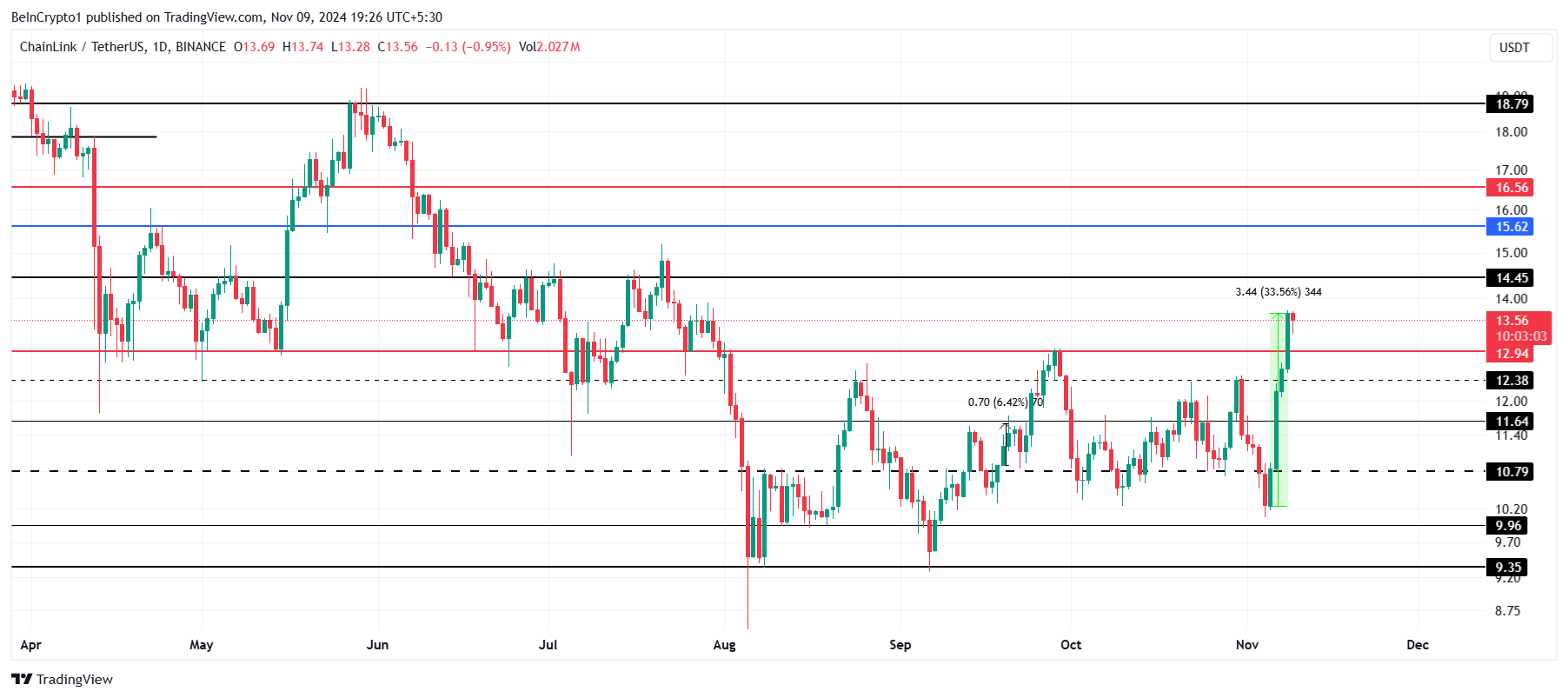 De Chainlink koers is de afgelopen drie dagen met 33,56% gestegen en wordt momenteel verhandeld op $13,56. Als het bullish momentum aanhoudt, zou LINK de weerstand op $14,45 kunnen omzetten in een steunniveau. Het vestigen van deze steun zou de rally versterken, waardoor LINK de basis krijgt die nodig is om zijn volgende doelen te benaderen.