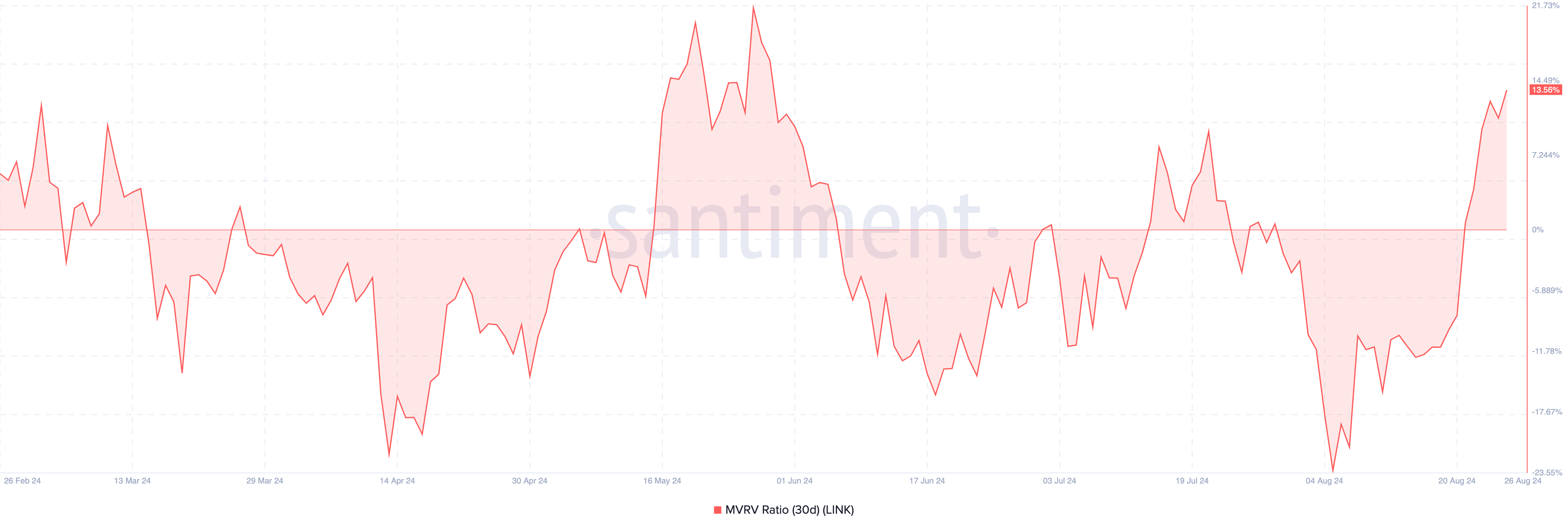 Maar wanneer de MVRV-ratio daalt, is er een lage mate van ongerealiseerde winsten, wat op onderwaardering duidt. Zoals te zien is in de onderstaande grafiek, is de 30-daagse MVRV-ratio van Chainlink 13,56%.