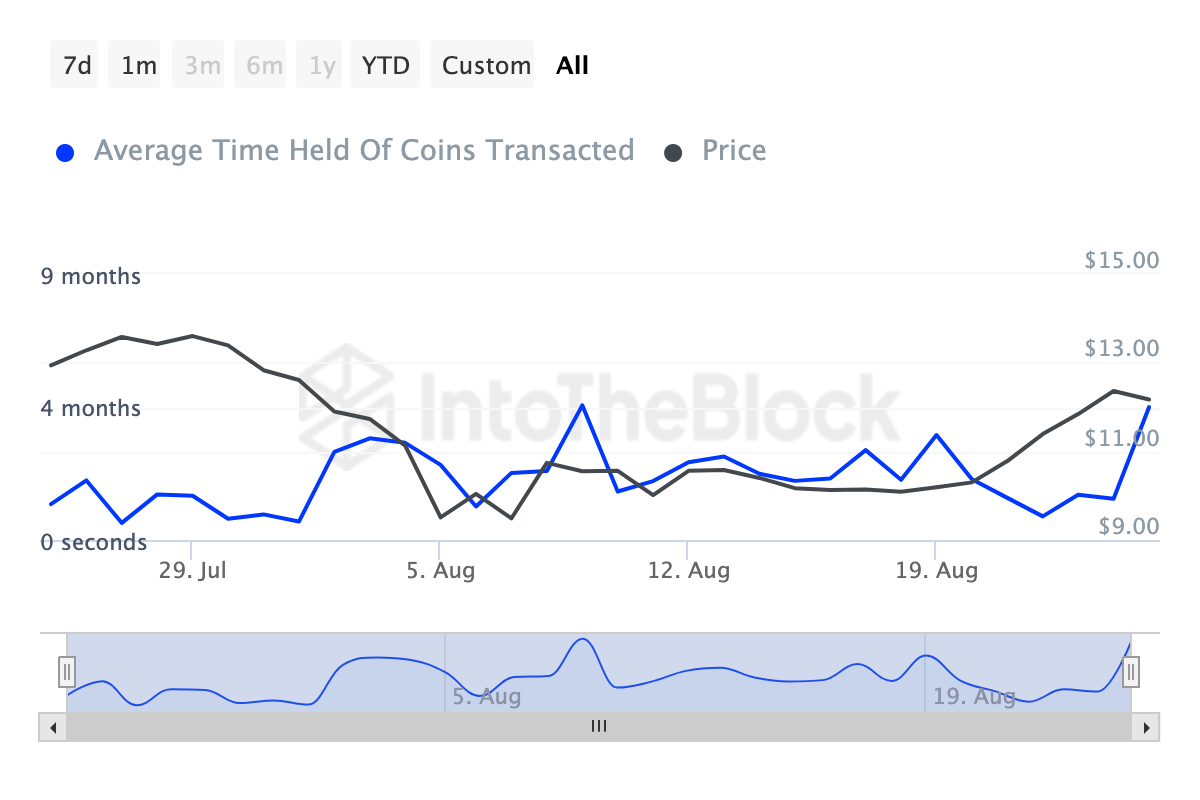 Volgens IntoTheBlock is de Coin Holding Time van de cryptocurrency sinds de laatste week van juli met 677% gestegen. Deze metriek volgt het gedrag van investeerders, waarbij wordt gekeken of ze hun activa verkopen of vasthouden zonder transacties.