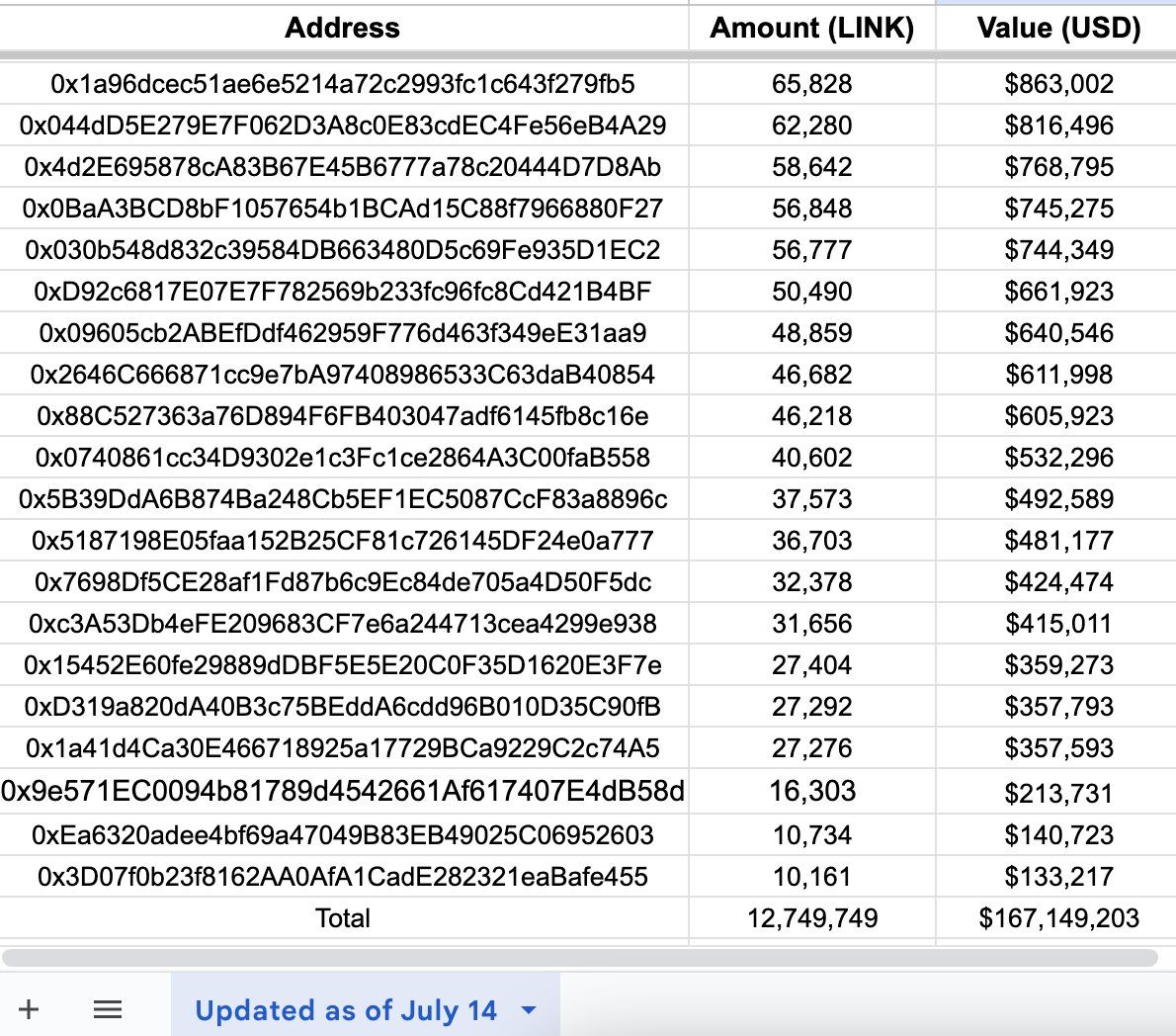 De belangstelling blijkt ook uit de accumulatie van whales voor LINK, de native token van Chainlink. Volgens het on-chain tracking platform Lookonchain hebben sinds 14 juli 93 nieuwe wallets 12,75 miljoen LINK, met een waarde van ongeveer $167 miljoen, van Binance gehaald sinds 24 juni.