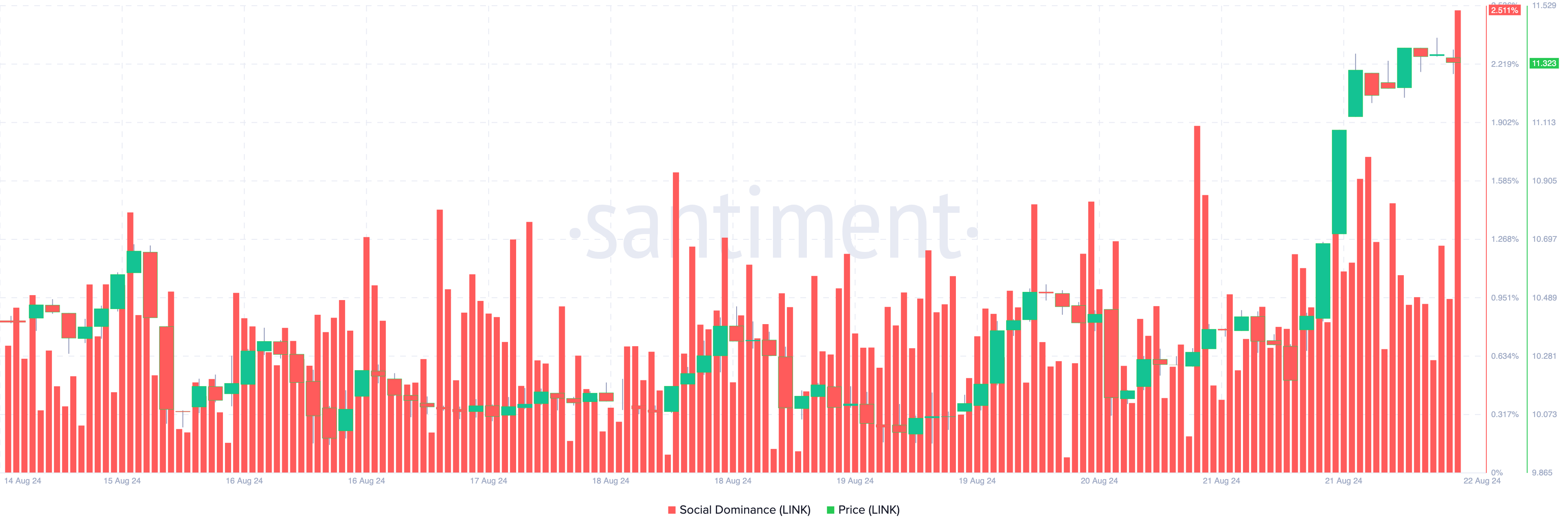 Volgens gegevens over sociale dominantie van Santiment heeft de recente prestatie van Chainlink bredere marktaandacht getrokken, wat de focus van andere activa afleidt. Sociale dominantie meet hoe vaak een project wordt besproken in vergelijking met andere in de top 100. Historisch gezien correleren toenemende vermeldingen vaak met koersbewegingen.