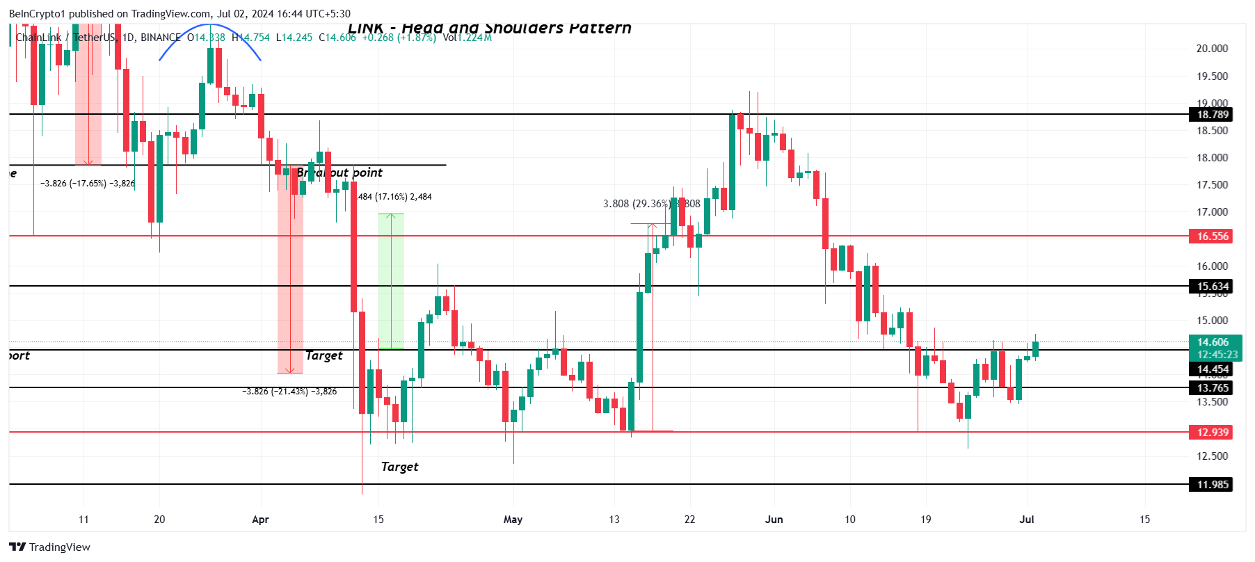 De LINK koers probeert momenteel de weerstand van $14,45 om te zetten in steun, en handelt op $14,63. Een succesvolle test van dit niveau als steun zou kunnen leiden tot een stijging richting de weerstand op $15,63.