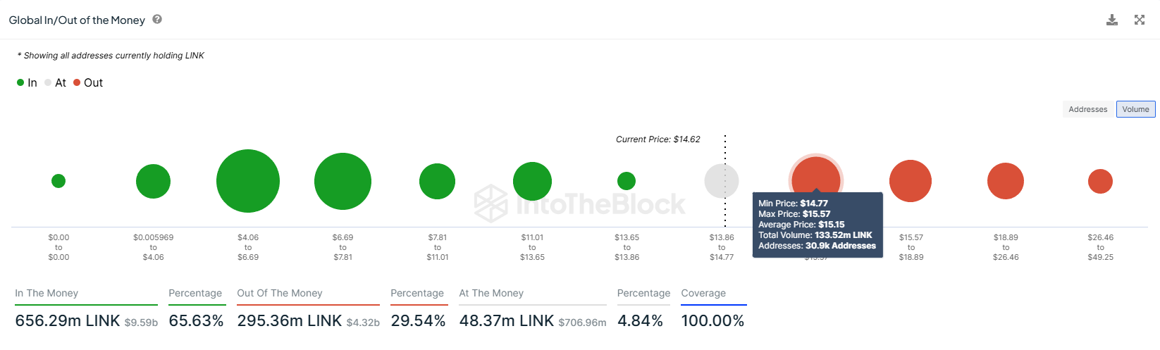 Deze voorraad is gekocht tussen $13,86 en $15,57. Gezien de LINK koers slechts met nog 6% hoeft te stijgen om $15,60 te bereiken, lijkt het waarschijnlijk dat deze voorraad binnenkort winstgevend wordt.