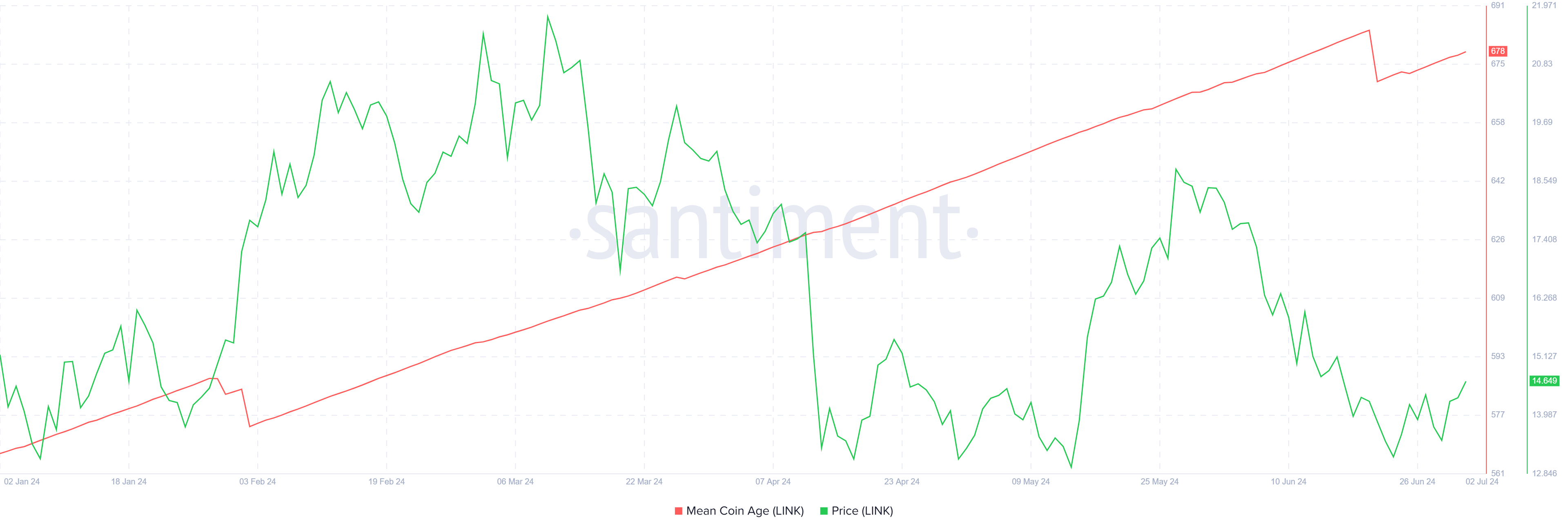 De Chainlink koers laat groene candlesticks zien op de dagelijkse grafiek, en dit wordt versterkt door de veerkracht die bij investeerders wordt waargenomen. Signalen hiervan zijn zichtbaar in de Mean Coin Age.