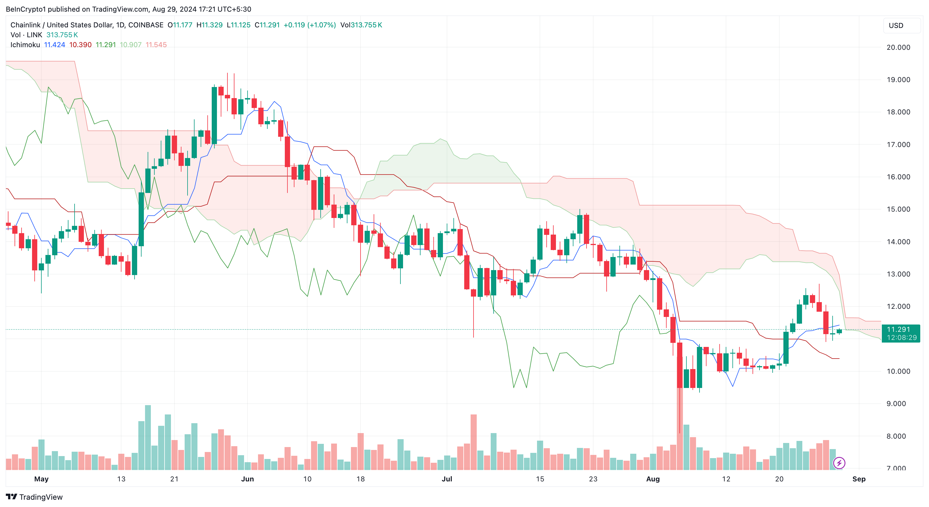 In het geval van LINK blijft de wolk boven de koers, wat aangeeft dat de altcoin mogelijk moeite heeft om op korte termijn boven de $11 regio uit te stijgen.