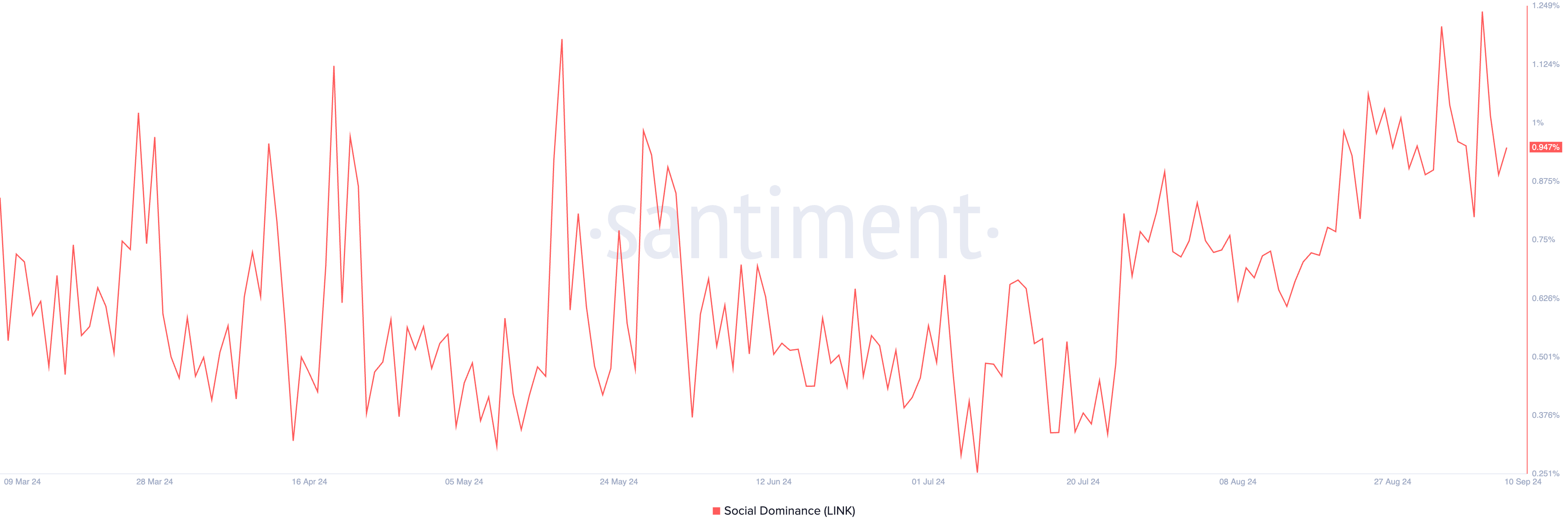 On-chain data van Santiment toont een piek in LINK’s sociale dominantie. Op 7 september sloot dit op een hoogtepunt van 1,24, het hoogste sinds december 2023.