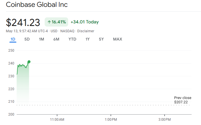 COIN opende vandaag, 13 mei, om 9:30 uur ET op de New York Stock Exchange (NYSE), vers van zijn opname in de S&P 500. Na de debuut steeg de COIN koers met meer dan 16% en wordt momenteel verhandeld voor $241,23.