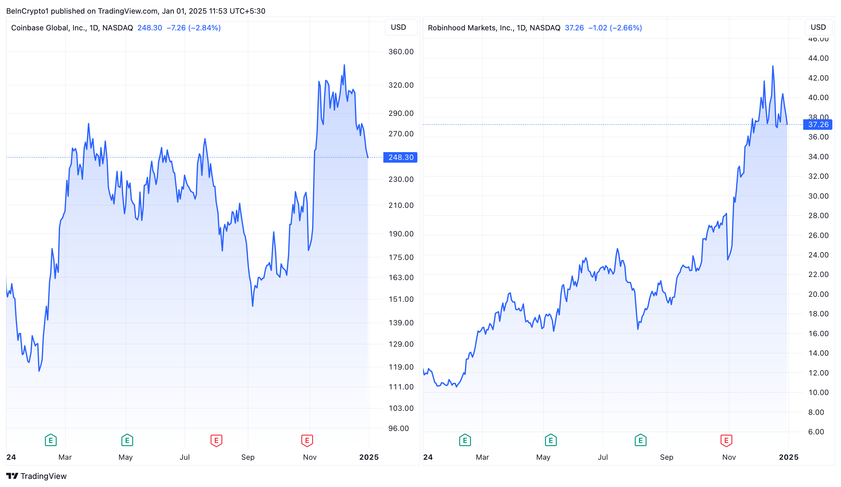 Coinbase begon 2024 met een aandelenkoers van $156 maar eindigde het jaar rond $250, een stijging van 50%. Robinhood-aandelen stegen ook met bijna 200% op de jaarlijkse grafieken.