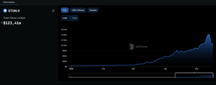 Geïntegreerd met Telegram Messenger, biedt STON.fi een gedecentraliseerd cross-chain platform, dat het mogelijk maakt om crypto assets te verhandelen op meerdere blockchains. Sinds het begin van 2024 is haar Total Value Locked (TVL) 26 keer omhoog geschoten naar meer dan $120 miljoen. Het platform leidt ook de TON blockchain in spot volume, met een bereik van ongeveer $676 miljoen in april.