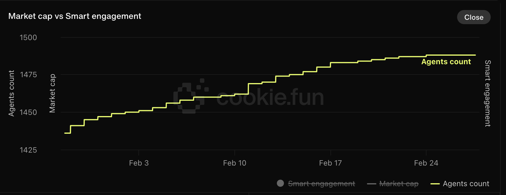 Na een korte periode van stabiliteit is het aantal gelanceerde crypto AI agents coins weer aan het stijgen, van 1.436 op 28 januari naar 1.488 op 27 februari.