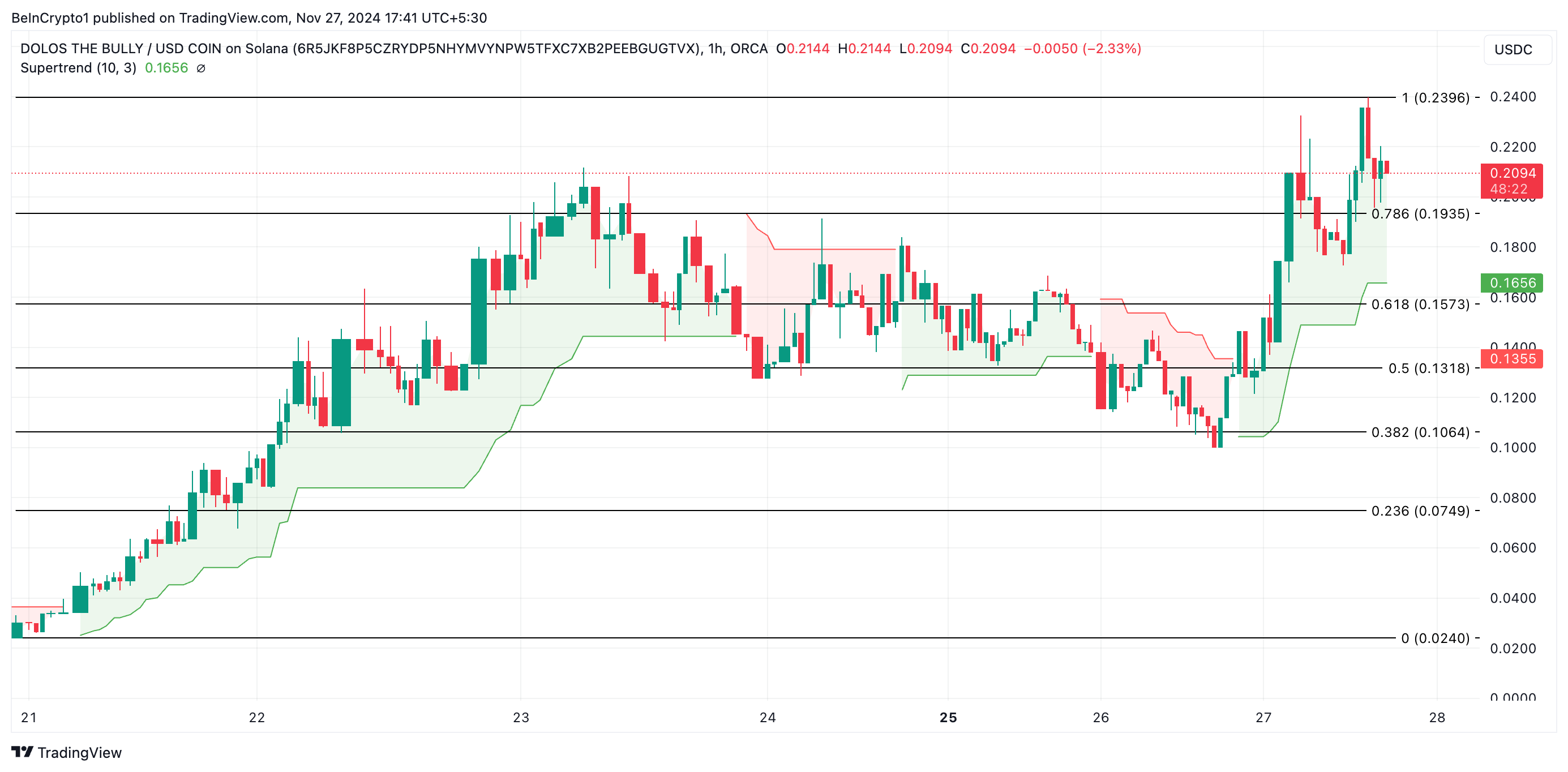 Solana-gebaseerde meme coin Dolos the Bully (BULLY) is vandaag naar een nieuwe all-time high gestegen. De meme coin handelde kort op een piek van $0,23 voordat er een terugval plaatsvond. Op het moment van schrijven handelt BULLY op $0,20 en blijft het een aanzienlijke bullish bias genieten.