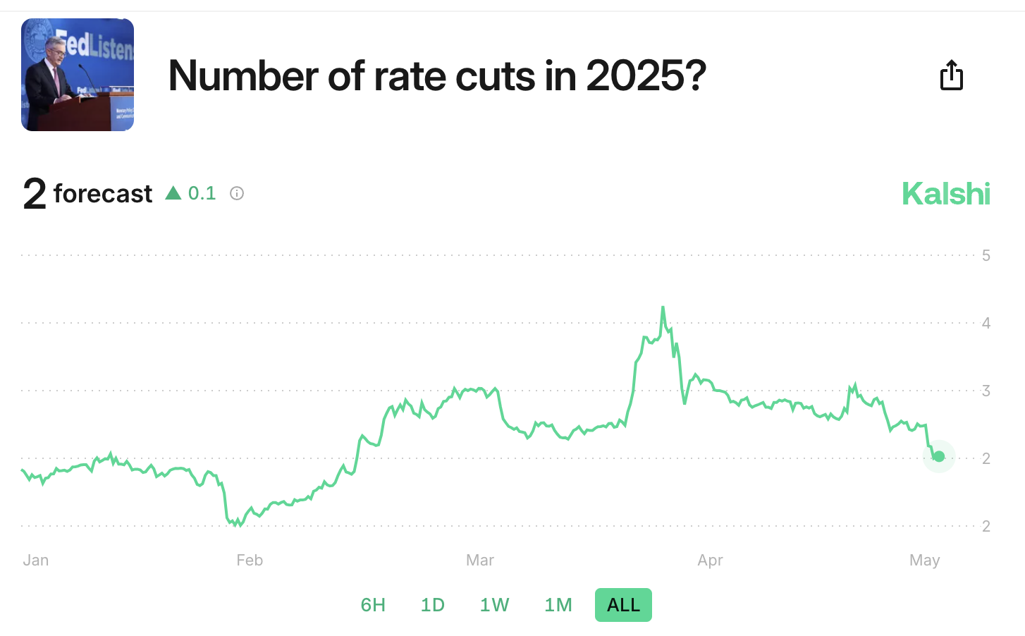 Inderdaad, dit scenario is wat er gebeurde, en Kalshi heeft sindsdien zijn verwachtingen verlaagd. Het verwacht momenteel slechts twee verlagingen voor de rest van het jaar, veel meer in lijn met de verwachtingen van andere bedrijven.