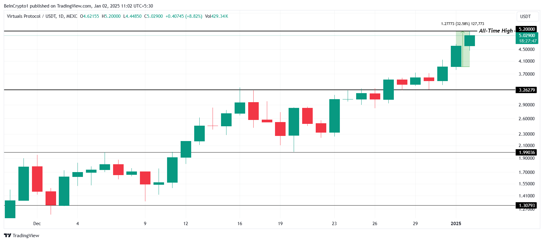 VIRTUAL steeg met 32% in de afgelopen 24 uur, bereikte een nieuwe all-time high van $5,20 voordat het zich vestigde op $5,02. Deze indrukwekkende stijging heeft de positie van de altcoin als sterke performer verstevigd, wat aanzienlijke aandacht van investeerders trekt.