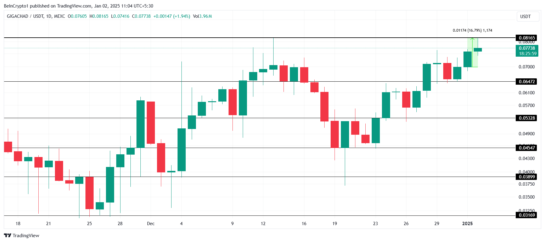 Een andere crypto token, GIGA’s koers zag een bescheiden stijging van 16% in de afgelopen dag, met een nieuwe all-time high (ATH) op $0,081. Dit niveau overtrof de vorige ATH die op 12 december 2024 werd geregistreerd. Hoewel de groei niet enorm is, weerspiegelt het een gestage momentum dat de interesse van investeerders levend houdt.