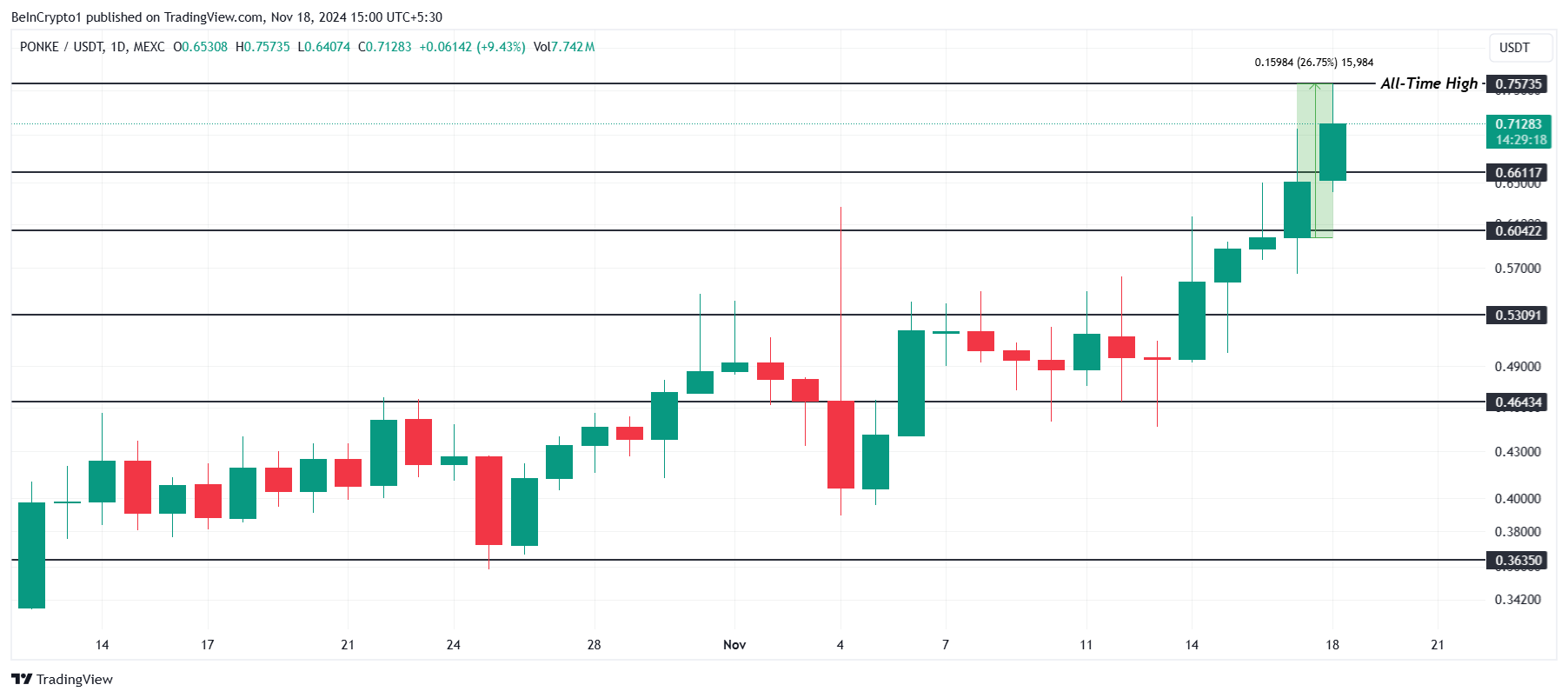 PONKE wordt verhandeld op $0,712 nadat de crypto een nieuwe all-time high van $0,757 bereikte tijdens de intra-day handelssessie op maandag. Deze stijging weerspiegelt sterke interesse van investeerders en sterke marktactiviteit, waardoor PONKE zich positioneert als een van de best presterende altcoins in recente handel.