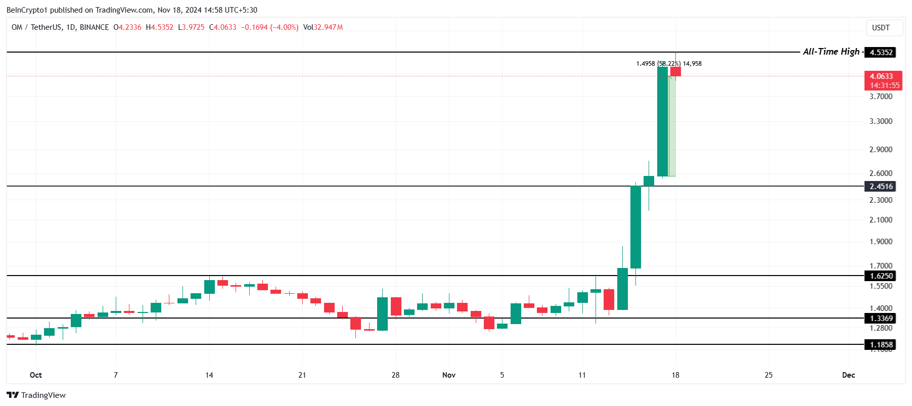 De OM koers bereikte vandaag een all-time high van $4,53, met een stijging van 58% in de afgelopen 24 uur. Momenteel handelt de altcoin op $4,06 en ervaart verhoogde interesse van investeerders terwijl het zijn bullish momentum probeert te behouden. De recente rally benadrukt de sterke vraag naar OM in de markt.