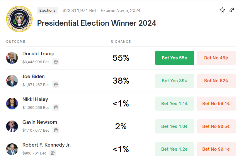 Volgens Polymarket, een platform voor cryptoweddenschappen, leidt Trump momenteel met een kans van 55% op de overwinning. Dit overtreft de huidige president, Joe Biden, die een kans van 38% heeft om herkozen te worden.